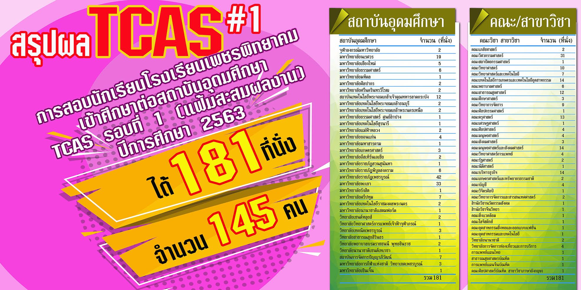 สรุปผล TCAS รอบที่ 1 (แฟ้มสะสมผลงาน) ปีการศึกษา 2563 นักเรียนโรงเรียนเพชรพิทยาคม ได้ 181 ที่นั่ง จำนวน 145 คน