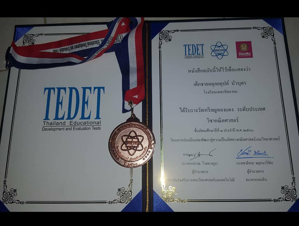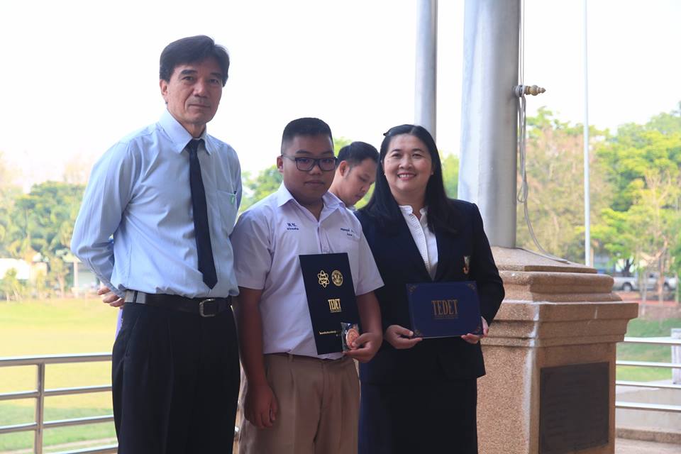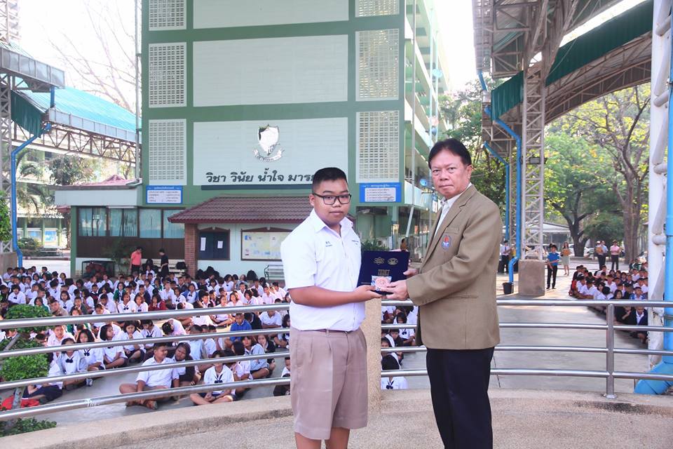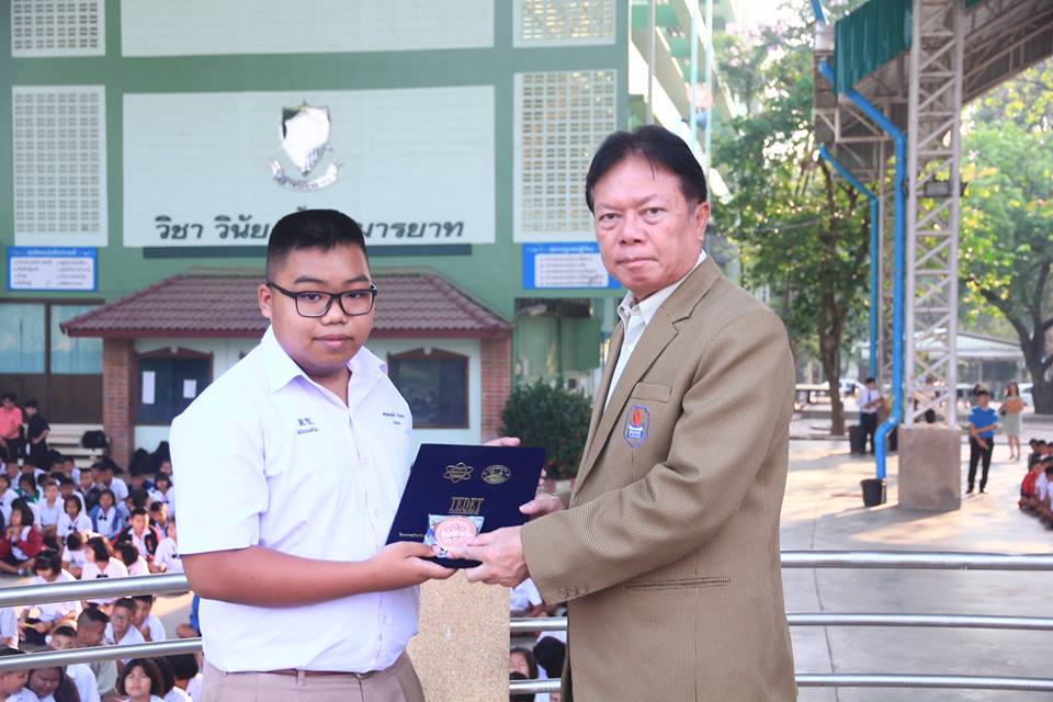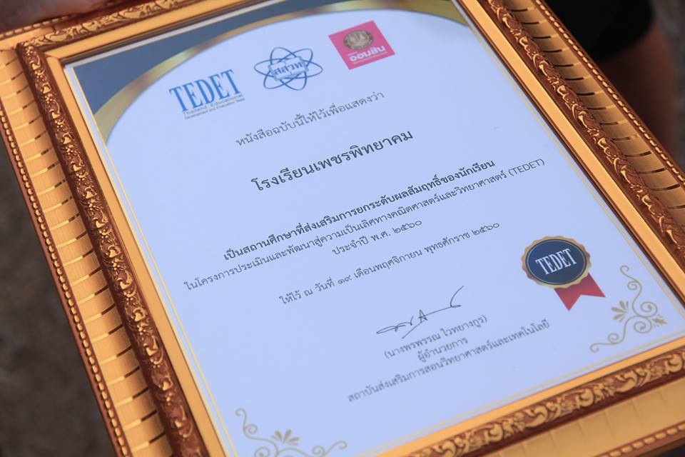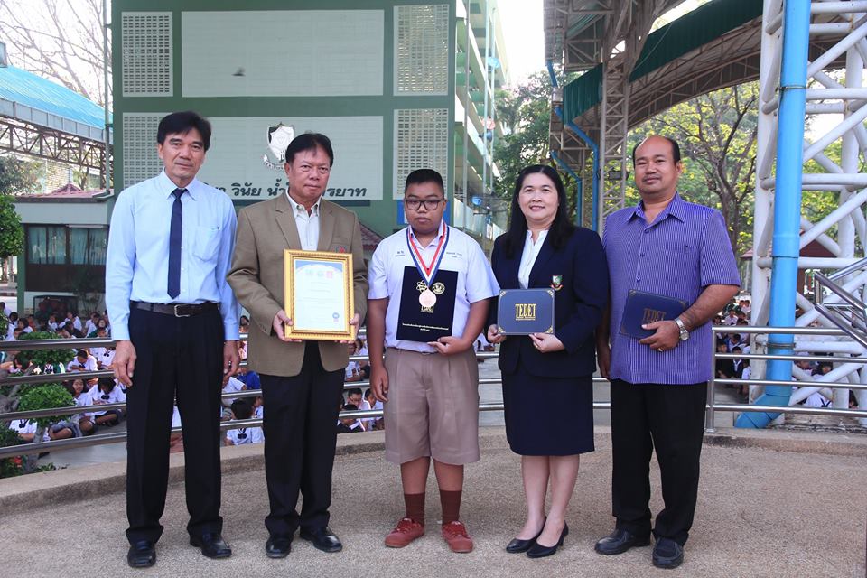 นายชัยชาย ปัญญาพวก ผู้อำนวยการโรงเรียนเพชรพิทยาคม มองรับรางวัลระดับเหรียญทองแดง ระดับประเทศ วิชาคณิตศาสตร์ (สสวท.) ชั้นมัยมศึกษาปีที่ 3 (คนเดียวของจังหวัดเพชรบูรณ์) โครงการประเมินและพัฒนาสู่ความเป็นเลิศทางคณิตศาสตร์และวิทยาศาสตร์ (สสวท.) ให้กับเด็กชายอดุลยคุปต์ บัวบุตร ชั้นมัธยมศึกษาปีที่ 3.1 โรงเรียนเพชรพิทยาคม