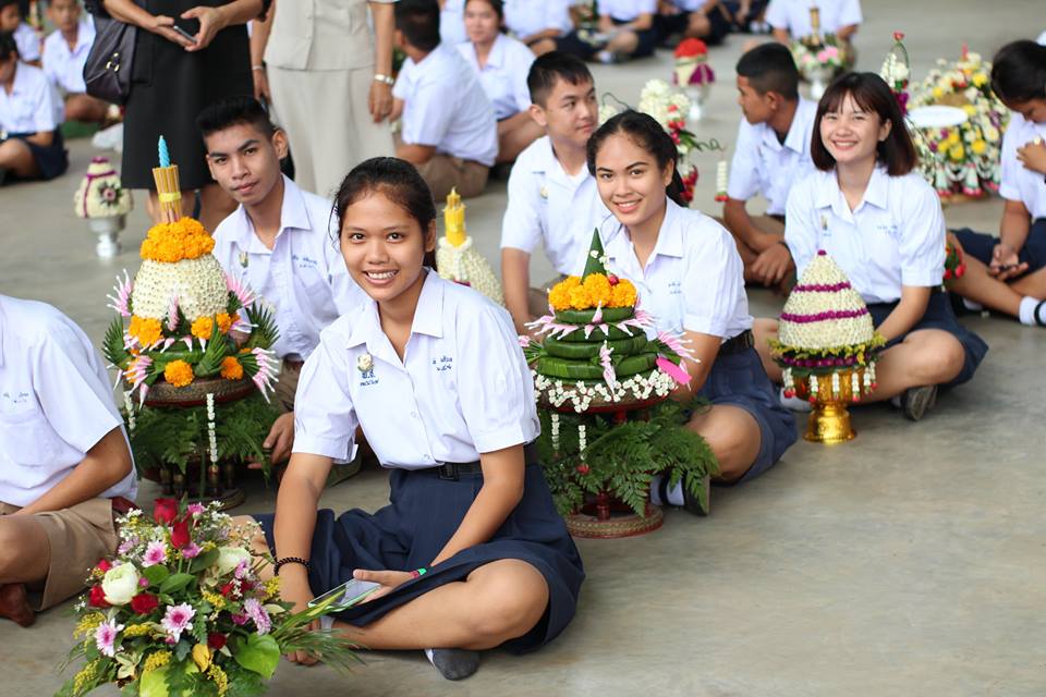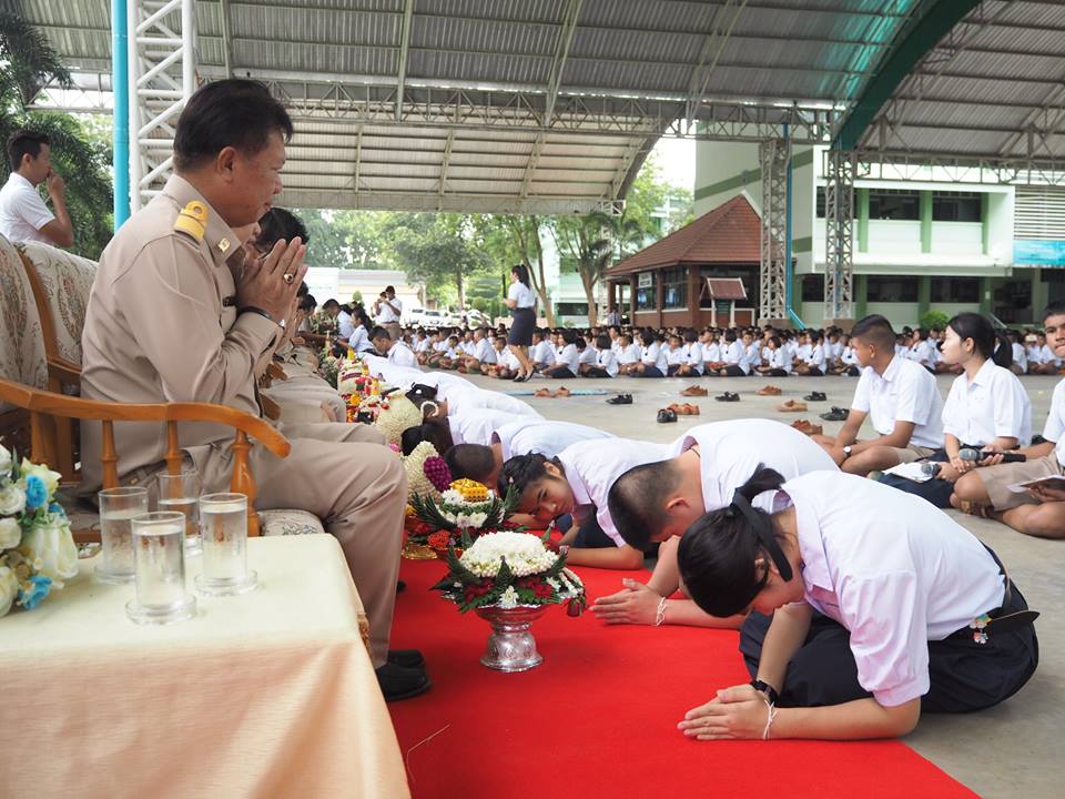 - นักเรียนแต่ละห้อง นำกรวยดอกไม้ธูปเทียนไปกราบคณะครูทีละแถวจนครบทุกแถว