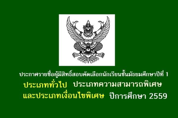 ประกาศรายชื่อผู้มีสิทธิ์สอบคัดเลือกนักเรียนชั้นมัธยมศึกษาปีที่ 1 ประเภททั่วไป ประเภทความสามารถพิเศษและประเภทเงื่อนไขพิเศษ ปีการศึกษา 2559