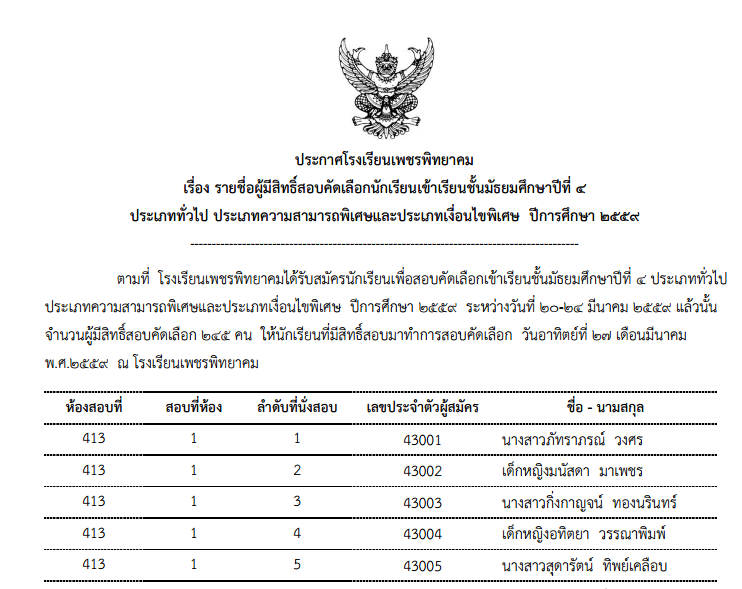 ประกาศรายชื่อผู้มีสิทธิ์สอบคัดเลือกนักเรียนชั้นมัธยมศึกษาปีที่ 4 ประเภททั่วไป ประเภทความสามารถพิเศษและประเภทเงื่อนไขพิเศษ ปีการศึกษา 2559