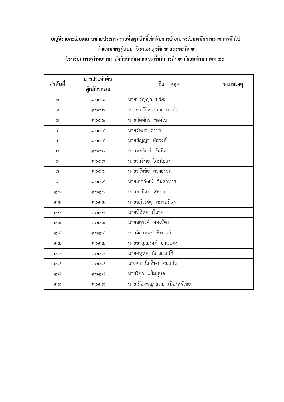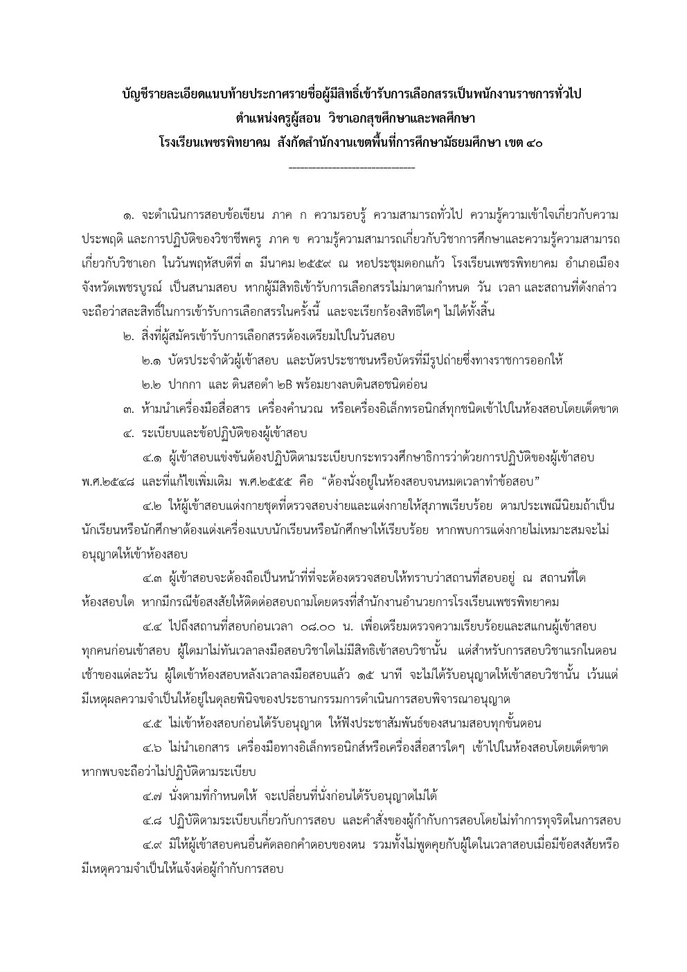 ประกาศรายชื่อผู้มีสิทธิ์เข้ารับการเลือกสรรเป็นพนักงานราชการทั่วไป ตำแหน่งครูผู้สอน วิชาเอก สุขศึกษาและพลศึกษา