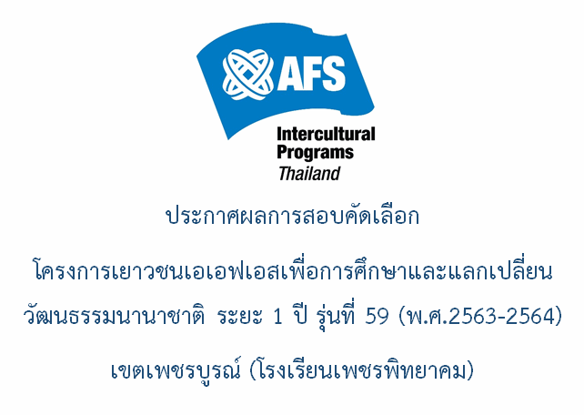 ประกาศผลการสอบคัดเลือก โครงการเยาวชนเอเอฟเอสเพื่อการศึกษาและแลกเปลี่ยนวัฒนธรรมนานาชาติ ระยะ 1 ปี รุ่นที่ 59 (พ.ศ.2563-2564) เขตเพชรบูรณ์ (โรงเรียนเพชรพิทยาคม)