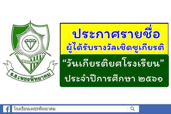 บัดนี้ การคัดเลือกบุคลากรเพื่อรับรางวัลเชิดชูเกียรติได้เสร็จสิ้นแล้ว โรงเรียนเพชรพิทยาคม จึงขอประกาศรายชื่อผู้ได้รับรางวัลเชิดชูเกียรติ “วันเกียรติยศโรงเรียน” ประจำปีการศึกษา ๒๕๖๑ จำนวน ๒๕๐ คน ดังรายชื่อแนบท้ายประกาศนี้