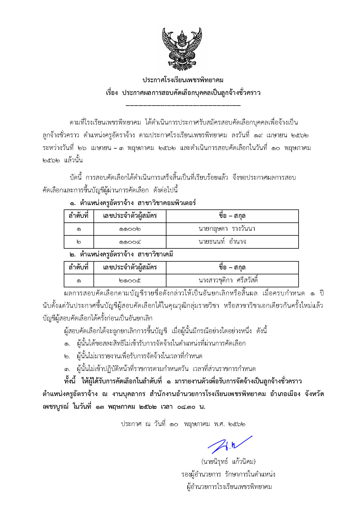 ตามที่โรงเรียนเพชรพิทยาคม ได้ดำเนินการประกาศรับสมัครสอบคัดเลือกบุคคลเพื่อจ้างเป็นลูกจ้างชั่วคราว ตำแหน่งครูอัตราจ้าง ตามประกาศโรงเรียนเพชรพิทยาคม ลงวันที่ ๑๙ เมษายน ๒๕๖๒ ระหว่างวันที่ ๒๖ เมษายน – ๓ พฤษภาคม ๒๕๖๒ และดำเนินการสอบคัดเลือกในวันที่ ๑๐ พฤษภาคม ๒๕๖๒ แล้วนั้น