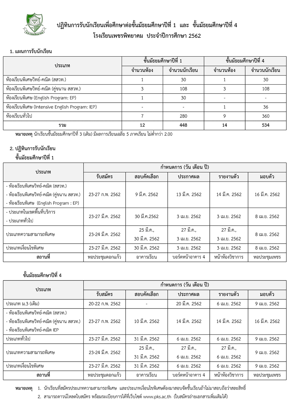 ปฏิทินการรับนักเรียนเข้าศึกษาต่อ ชั้นม.1 และ ม.4 ปีการศึกษา 2562