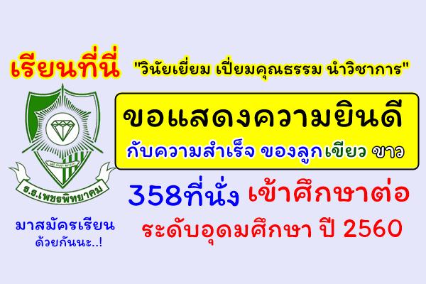 วันนี้(21 กุมภาพันธ์ 256) โรงเรียนเพชรพิทยาคม จังหวัดเพชรบูรณ์ ขอแสดงความยินดีกับ ลูกเขียว ขาว นักเรียนโรงเรียนเพชรพิทยาคม ที่สอบแข่งขันฯ เข้าศึกษาต่อในระดับอุดมศึกษา โควต้า, รับตรง ประจำปี 2560 ได้ จำนวน 358 ที่นั่ง