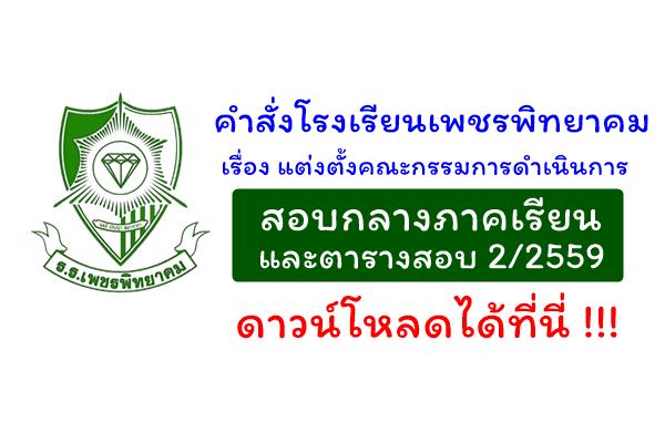 เพื่อให้การวัดและประเมินผล ดำเนินไปตามระเบียบว่าด้วยการวัดและประเมินผลตามหลักสูตรสถานศึกษาโรงเรียนเพชรพิทยาคม จึงกำหนดให้มีการสอบวัดผลกลางภาคเรียน ประจำภาคเรียนที่ 2 ปีการศึกษา 2559 ระหว่างวันที่ 29-30 ธันวาคม 2559 อาศัยอำนาจตามความในมาตรา 39 แห่งพระราชบัญญัติระเบียบบริหารราชการกระทรวงศึกษาธิการ พ.ศ. 2546 จึงแต่งตั้งคณะกรรมการดำเนินการสอบวัดผลกลางภาคเรียน ประจำภาคเรียนที่ 2 ปีการศึกษา 2559 ปฏิบัติหน้าที่ ดังนี้