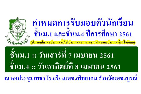 ด้วย โรงเรียนเพชรพิทยาคม ได้ดำเนินการสอบคัดเลือก ประกาศผลและรายงานตัวนักเรียนเข้าเรียนชั้นมัธยมศึกษาปีที่ 1 และชั้นมัธยมศึกษาปีที่ 4 ปีการศึกษา 2561 (ประเภทโควตา ประเภททั่วไป ประเภทความสามารถพิเศษและ ประเภทเงื่อนไขพิเศษ) จึงกำหนดมอบตัวนักเรียนชั้นมัธยมศึกษาปีที่ 1 ในวันเสาร์ที่ 7 เมษายน 2561 และนักเรียนชั้นมัธยมศึกษาปีที่ 4 ในวันอาทิตย์ที่ 8 เมษายน 2561 ณ หอประชุมเพชร โรงเรียนเพชรพิทยาคม
