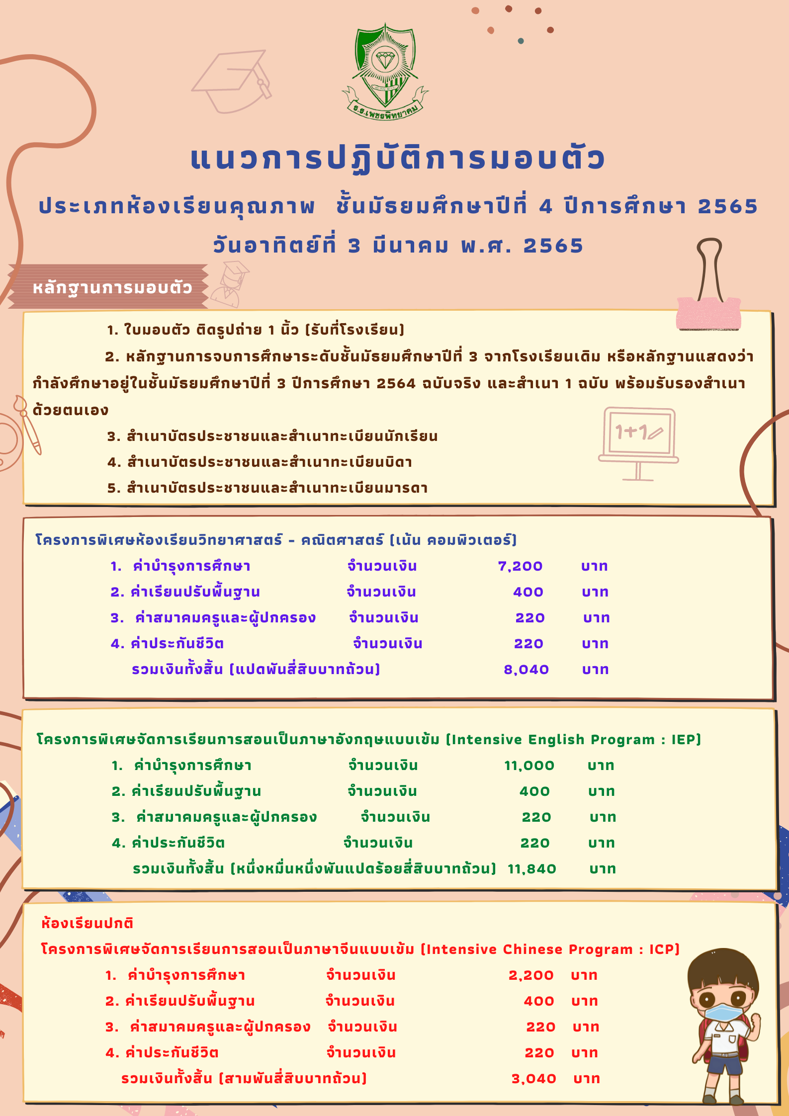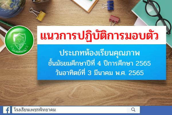 แนวการปฏิบัติการมอบตัว ประเภทห้องเรียนคุณภาพ ชั้นมัธยมศึกษาปีที่ 4 ปีการศึกษา 2565 วันอาทิตย์ที่ 3 มีนาคม พ.ศ. 2565