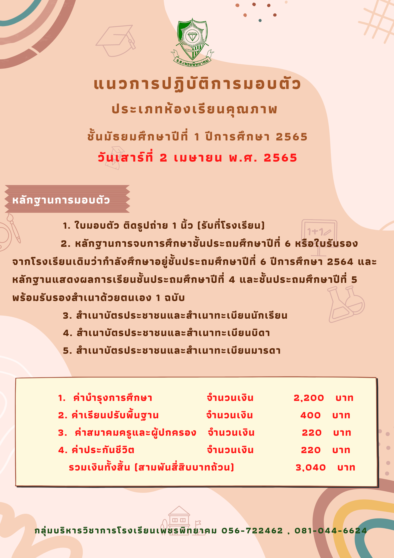 แนวการปฏิบัติการมอบตัว ประเภทห้องเรียนคุณภาพ ชั้นมัธยมศึกษาปีที่ 1 ปีการศึกษา 2565 วันเสาร์ที่ 2 เมษายน พ.ศ. 2565