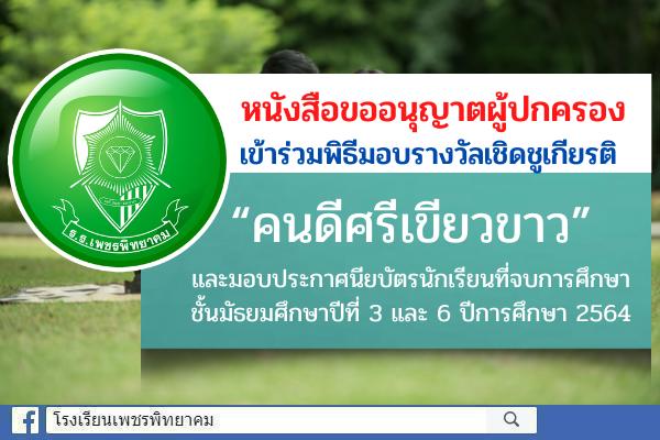 หนังสือขออนุญาตผู้ปกครอง เข้าร่วมพิธีมอบรางวัลเชิดชูเกียรติ “คนดีศรีเขียวขาว” และมอบประกาศนียบัตรนักเรียนที่จบการศึกษาชั้นมัธยมศึกษาปีที่ 3 และ 6 จบการศึกษา 2564