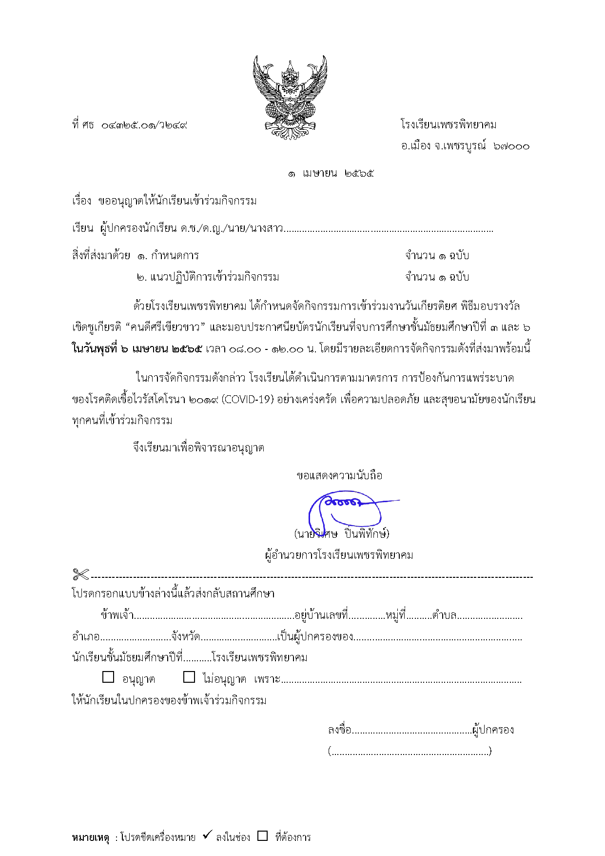 หนังสือขออนุญาตผู้ปกครอง เข้าร่วมพิธีมอบรางวัลเชิดชูเกียรติ “คนดีศรีเขียวขาว” และมอบประกาศนียบัตรนักเรียนที่จบการศึกษาชั้นมัธยมศึกษาปีที่ 3 และ 6 ปีการศึกษา 2564