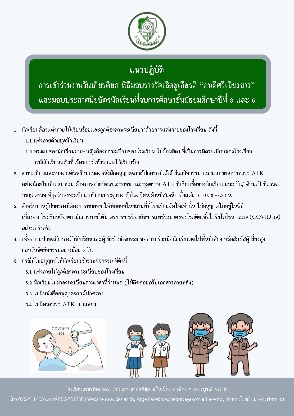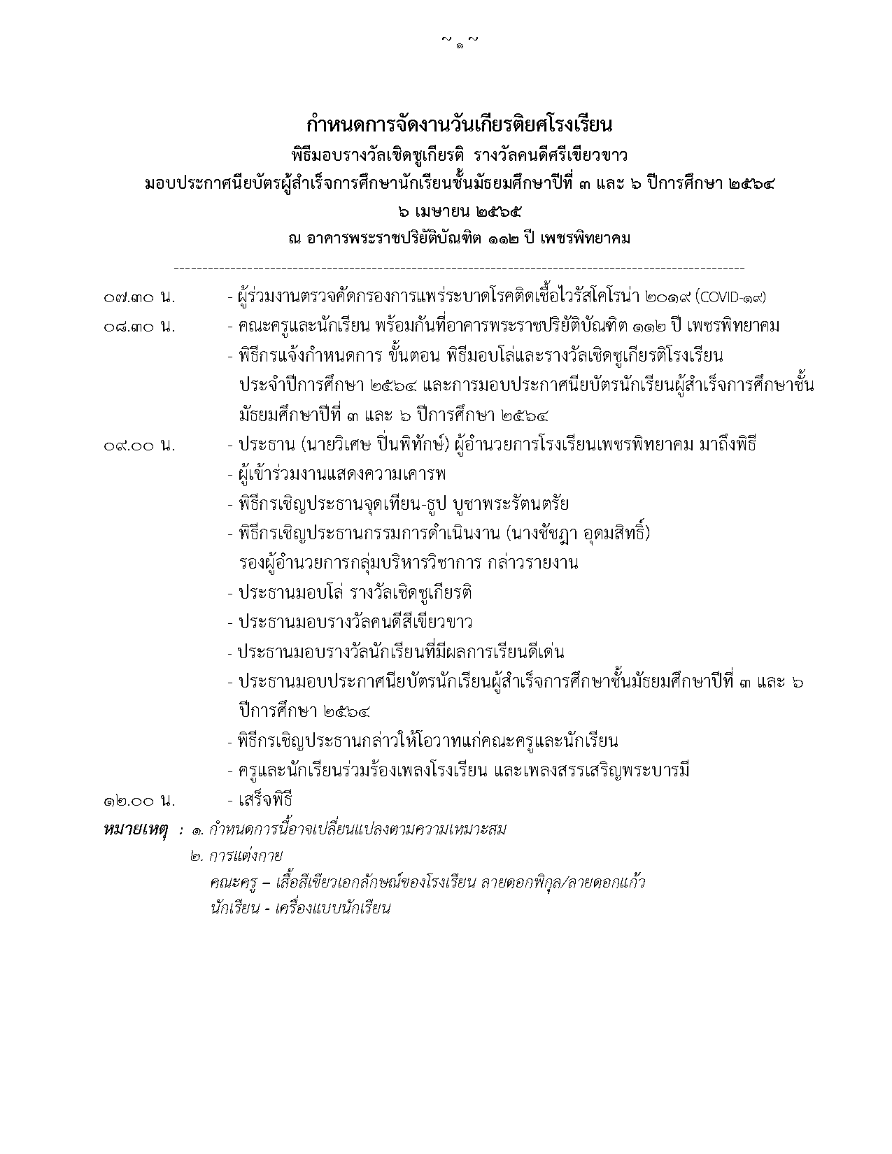 ด้วยโรงเรียนเพชรพิทยาคม ได้กำหนดจัดกิจกรรมการเข้าร่วมงานวันเกียรติยศ พิธีมอบรางวัลเชิดชูเกียรติ “คนดีศรีเขียวขาว” และมอบประกาศนียบัตรนักเรียนที่จบการศึกษาชั้นมัธยมศึกษาปีที่ 3 และ 6 ในวันพุธที่ 6 เมษายน 2565 เวลา 08.00 - 12.00 น. โดยมีรายละเอียดการจัดกิจกรรมดังที่ส่งมาพร้อมนี้