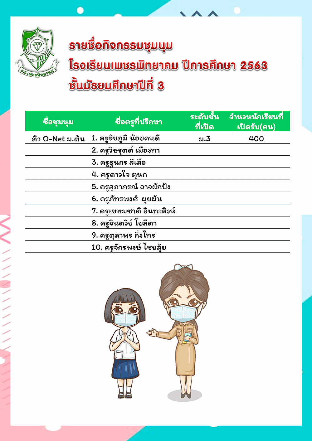 ประกาศรายชื่อกิจกรรมชุมนุม โรงเรียนเพชรพิทยาคม ปีการศึกษา 2563