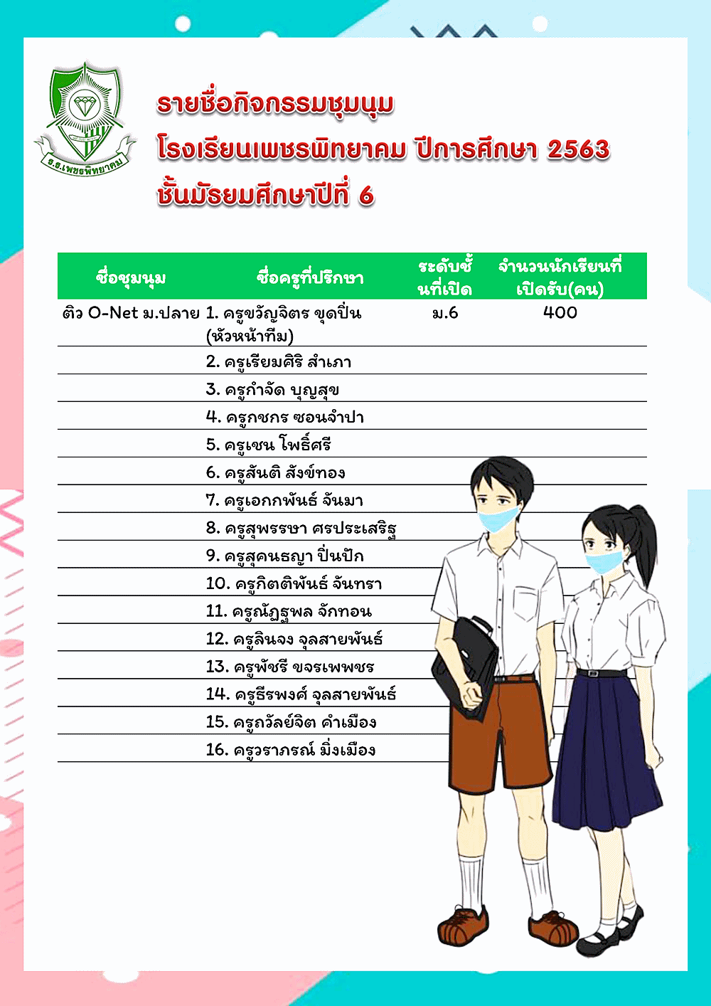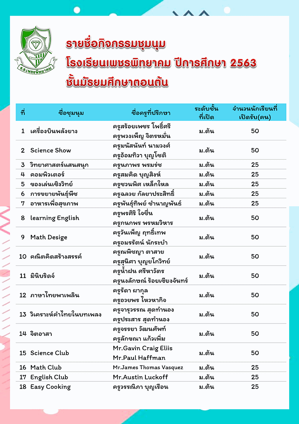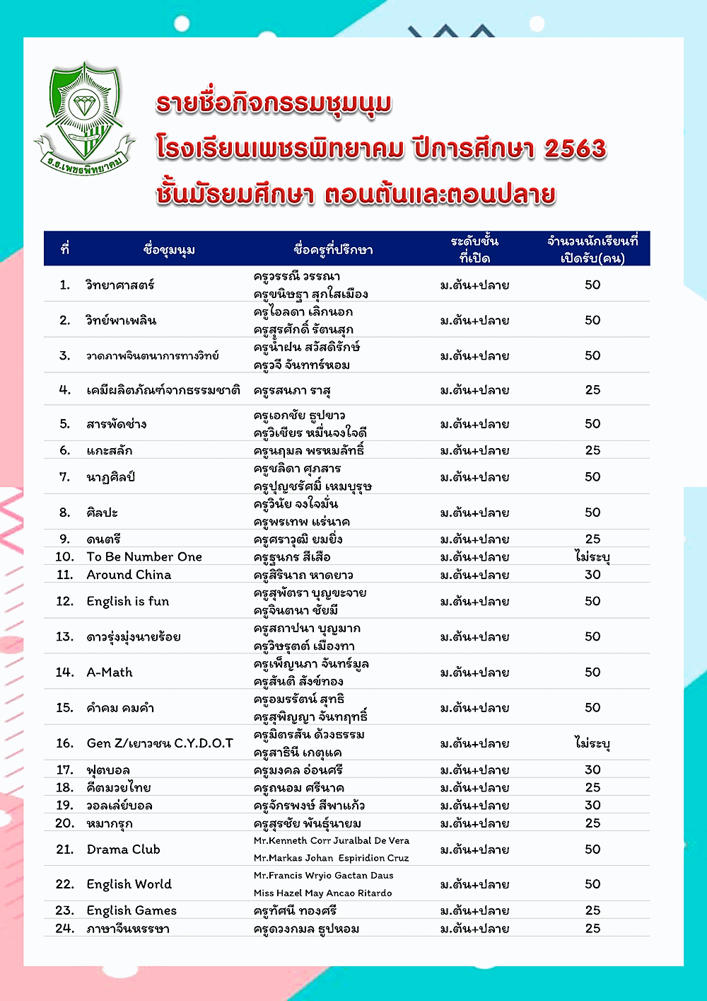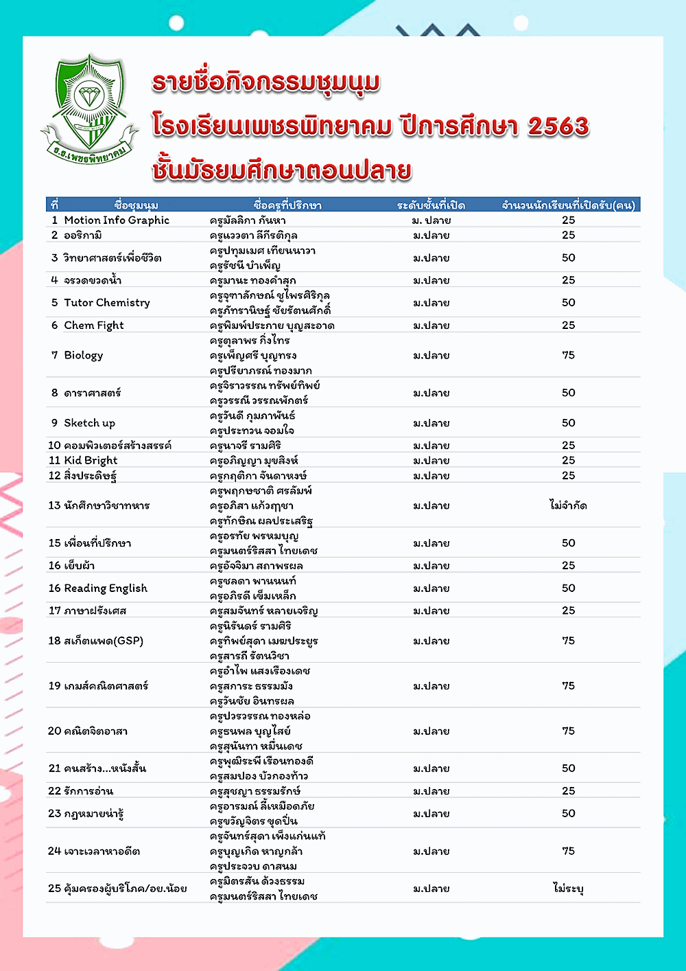 รายชื่อกิจกรรมชุมนุม โรงเรียนเพชรพิทยาคม ปีการศึกษา 2563