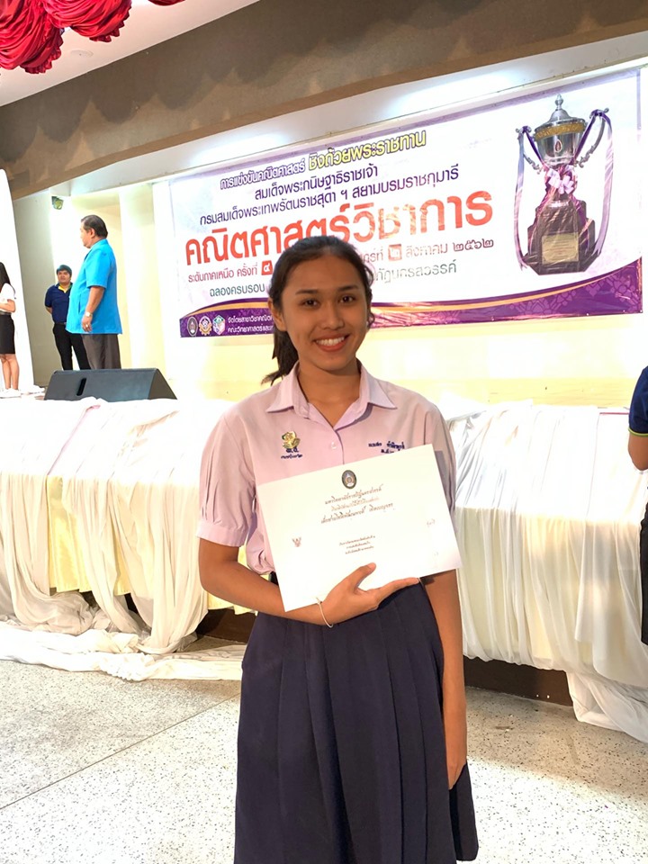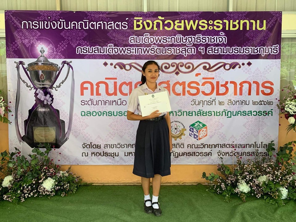 3. นางสาวนารากร วรกุล ชั้นมัธยมศึกษาปีที่ 6.2 รับเกียรติบัตรระดับเหรียญเงิน อันดับ 20 การแข่งขัน Sudoku ระดับ ม.ปลาย (จากผู้เข้าแข่งขัน 153 คน) ผู้ฝึกสอน ครูสถาปนา บุญมาก