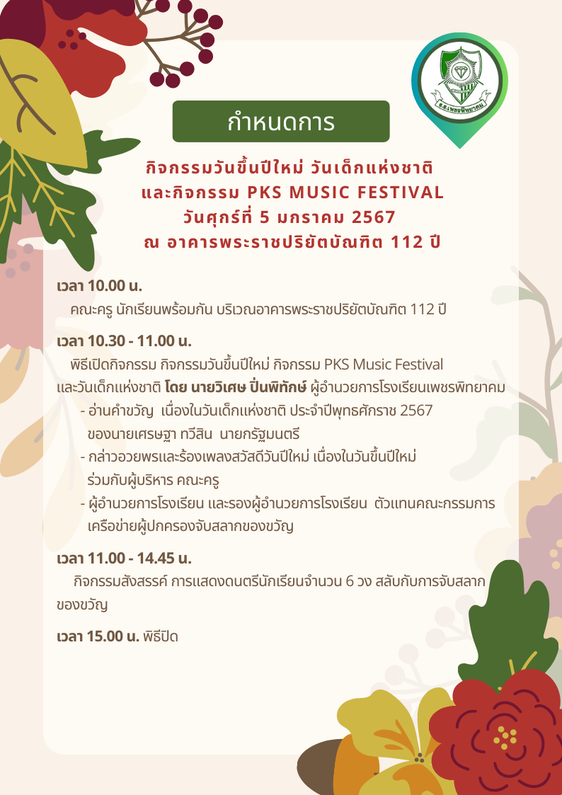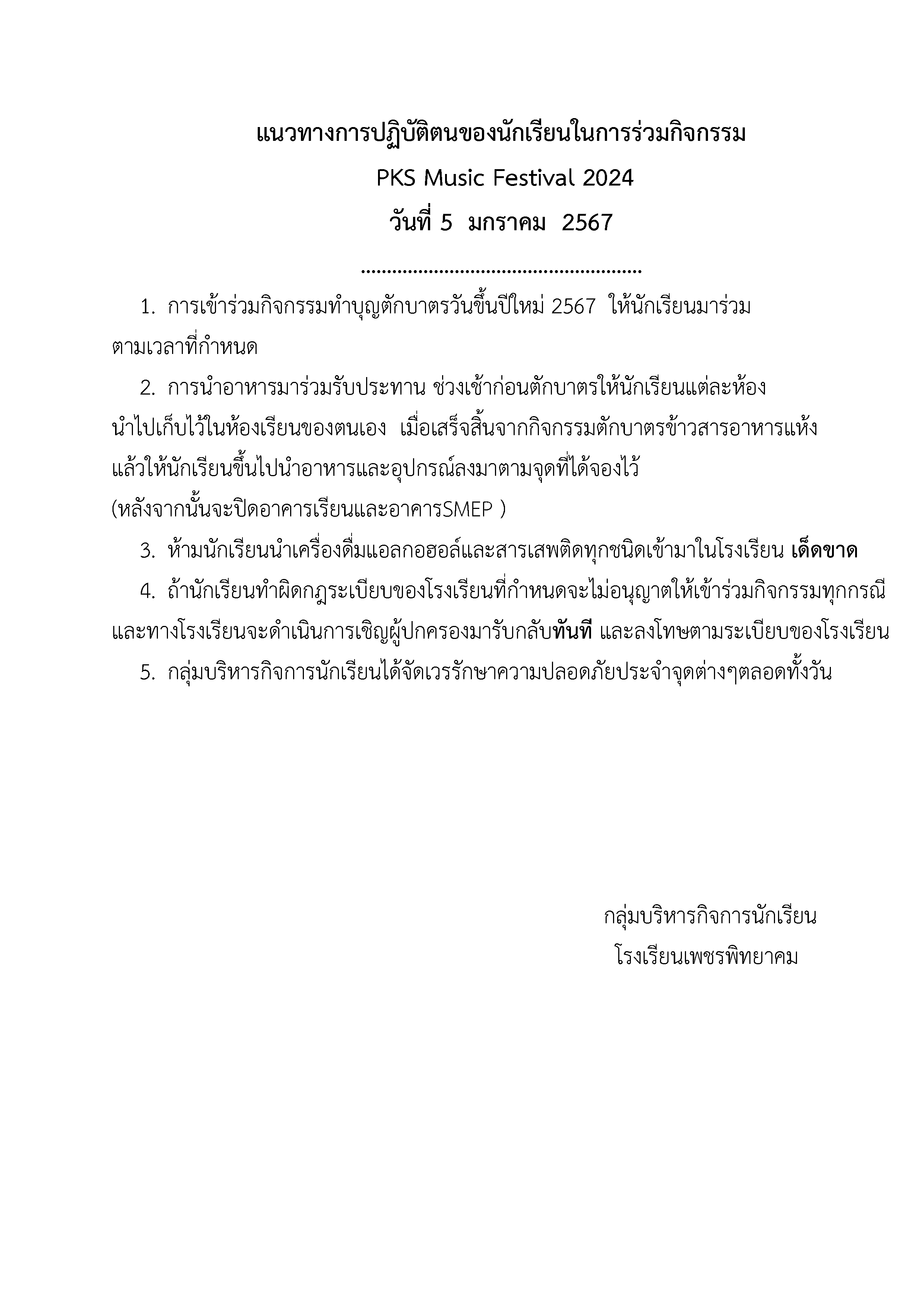 แนวทางการปฏิบัติตนของนักเรียนในการร่วมกิจกรรม PKS Music Festival 2024 วันที่ 5 มกราคม 2567