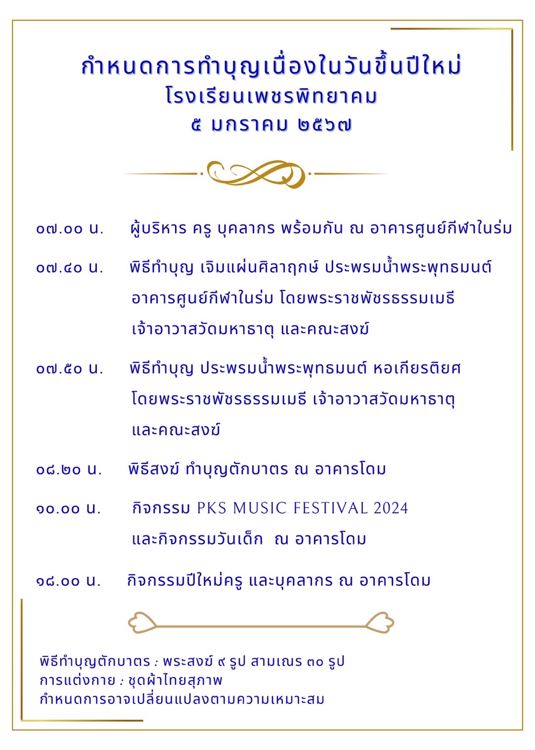 1. การเข้าร่วมกิจกรรมทำบุญตักบาตรวันขึ้นปีใหม่ 2567 ให้นักเรียนมาร่วมตามเวลาที่กำหนด