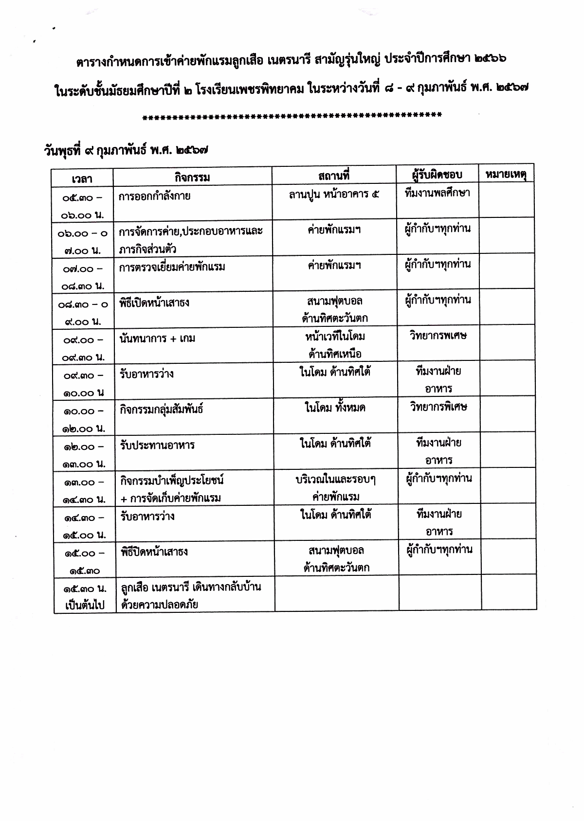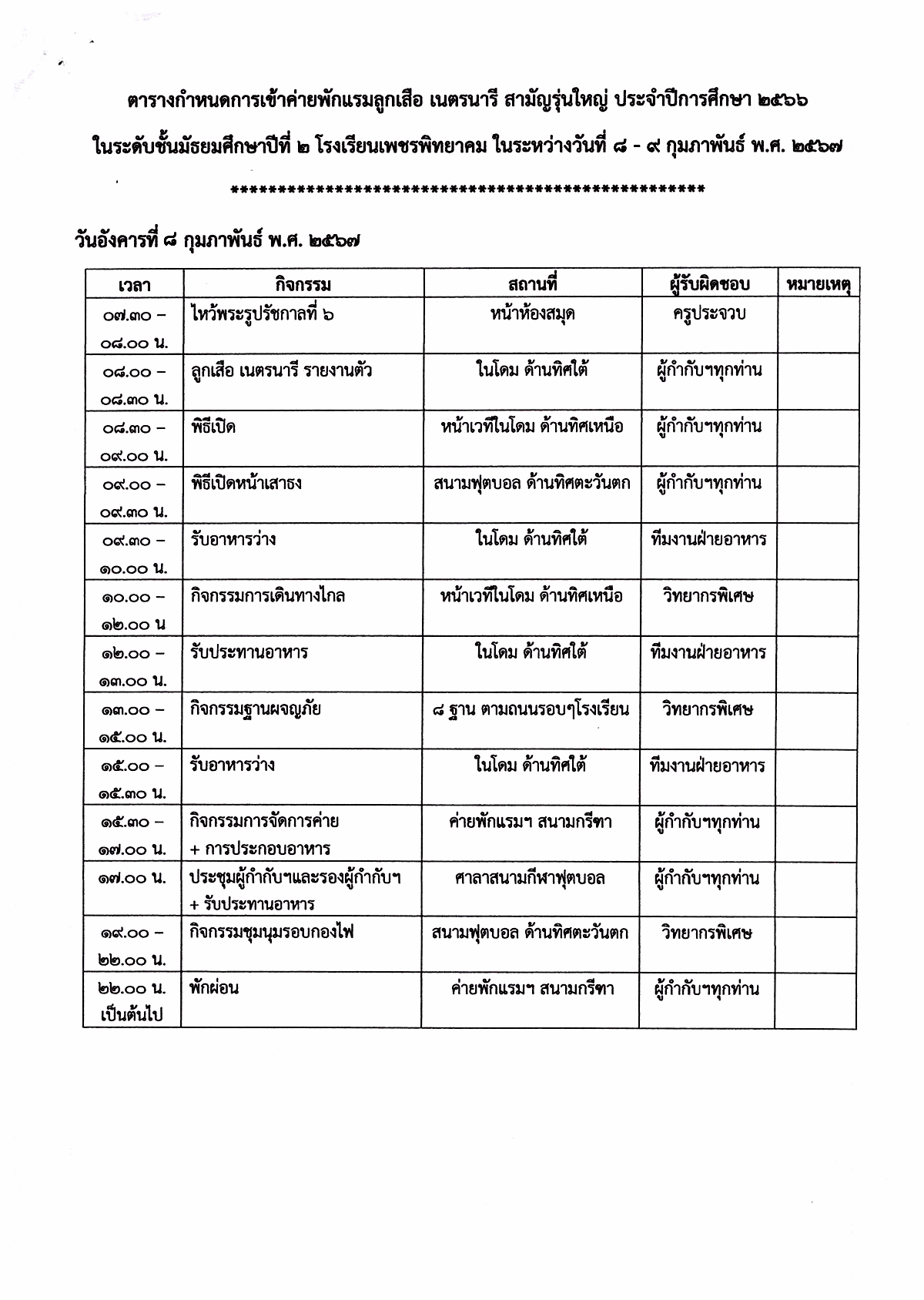 กำหนดการจัดกิจกรรมเข้าค่ายพักแรมและเดินทางไกล ลูกเสือ เนตรนารี ชั้นมัธยมศึกษาปีที่ 2 ประจำปีการศึกษา 2566 ระหว่างวันที่ 8-9 กุมภาพันธ์ 2567