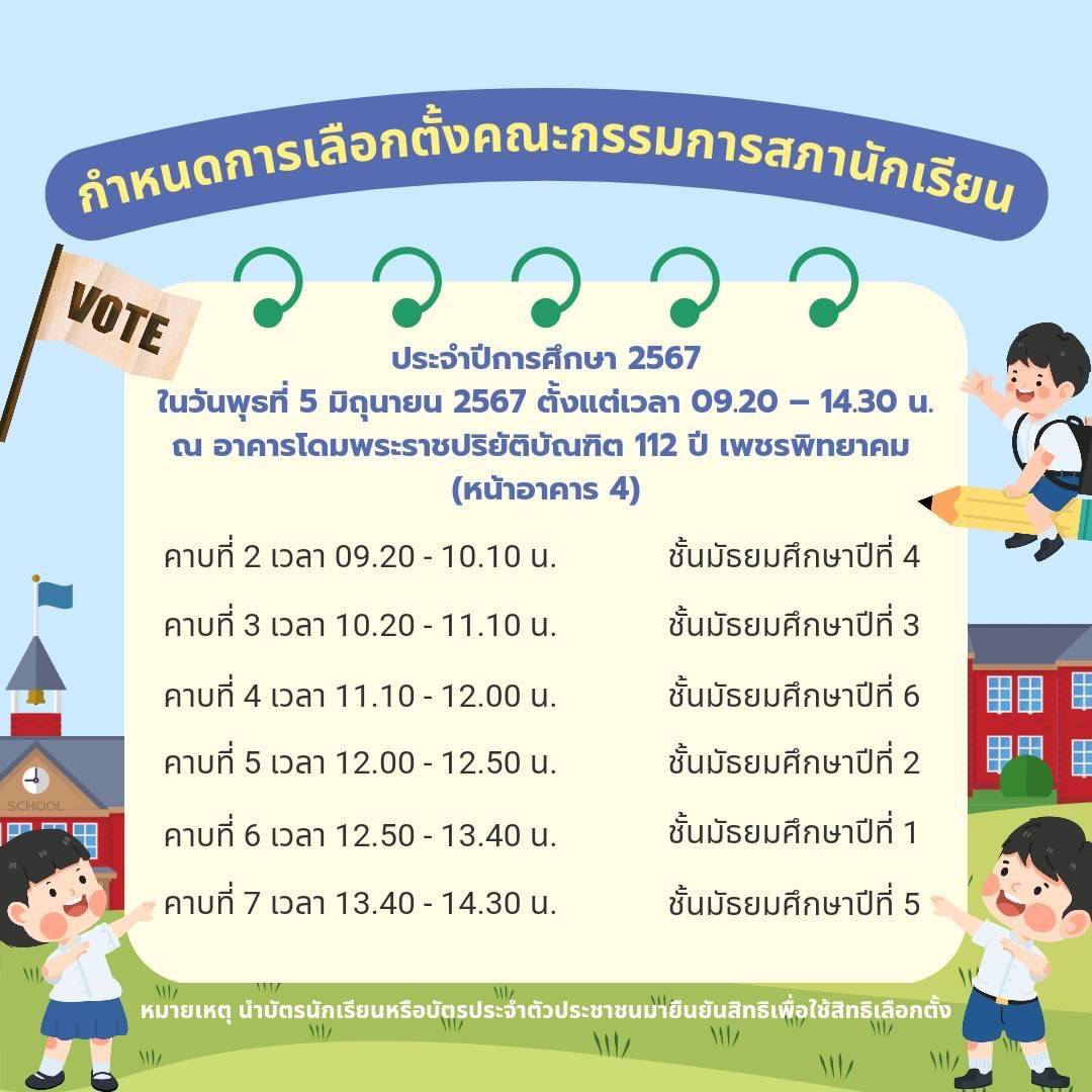 กำหนดการเลือกตั้งคณะกรรมการสภานักเรียน ประจำปีการศึกษา 2567 ในวันพุธที่ 5 มิถุนายน 2567 ตั้งแต่เวลา 09.20 – 14.30 น. ณ อาคารโดมพระราชปริยัติบัณฑิต 112 ปี เพชรพิทยาคม (หน้าอาคาร 4)