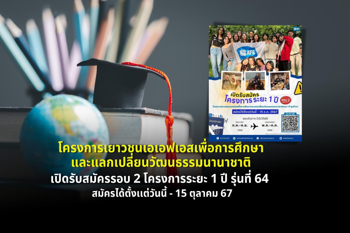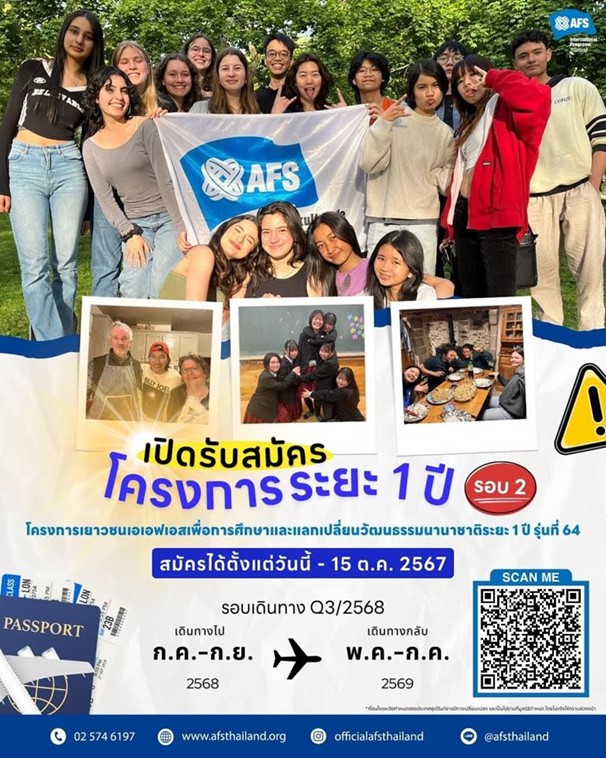 โครงการเยาวชนเอเอฟเอสเพื่อการศึกษาและแลกเปลี่ยนวัฒนธรรมนานาชาติ เปิดรับสมัครรอบ 2 โครงการระยะ 1 ปี รุ่นที่ 64 สมัครได้ตั้งเเต่วันนี้ - 15 ตุลาคม 67