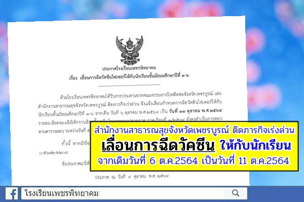 ด้วยโรงเรียนเพชรพิทยาคมได้รับการประสานจากคณะกรรมการโรคติดต่อจังหวัดเพชรบูรณ์ และสำนักงานสาธารณสุขจังหวัดเพชรบูรณ์ ติดภารกิจเร่งด่วน จึงแจ้งเลื่อนกำหนดการฉีดวัคซีนไฟเซอร์ให้กับนักเรียนชั้นมัธยมศึกษาปีที่ 1-6 จากเดิม วันที่ 6 ตุลาคม พ.ศ.2564 เป็น วันที่ 11 ตุลาคม พ.ศ.2564 รายละเอียดจะแจ้งให้ทราบอีกครั้ง อนึ่ง ในการสอบปลายภาค ภาคเรียนที่ 1/2564 ยังคงดำเนินการสอบตามตารางสอบ ระหว่างวันที่ 5 - 8 ตุลาคม พ.ศ.2564
