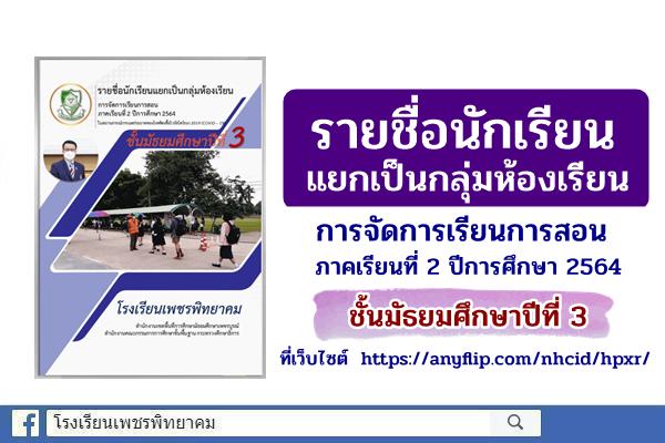 รายชื่อนักเรียนแยกเป็นกลุ่มห้องเรียน การจัดการเรียนการสอน ภาคเรียนที่ 2 ปีการศึกษา 2564 ชั้นมัธยมศึกษาปีที่ 3