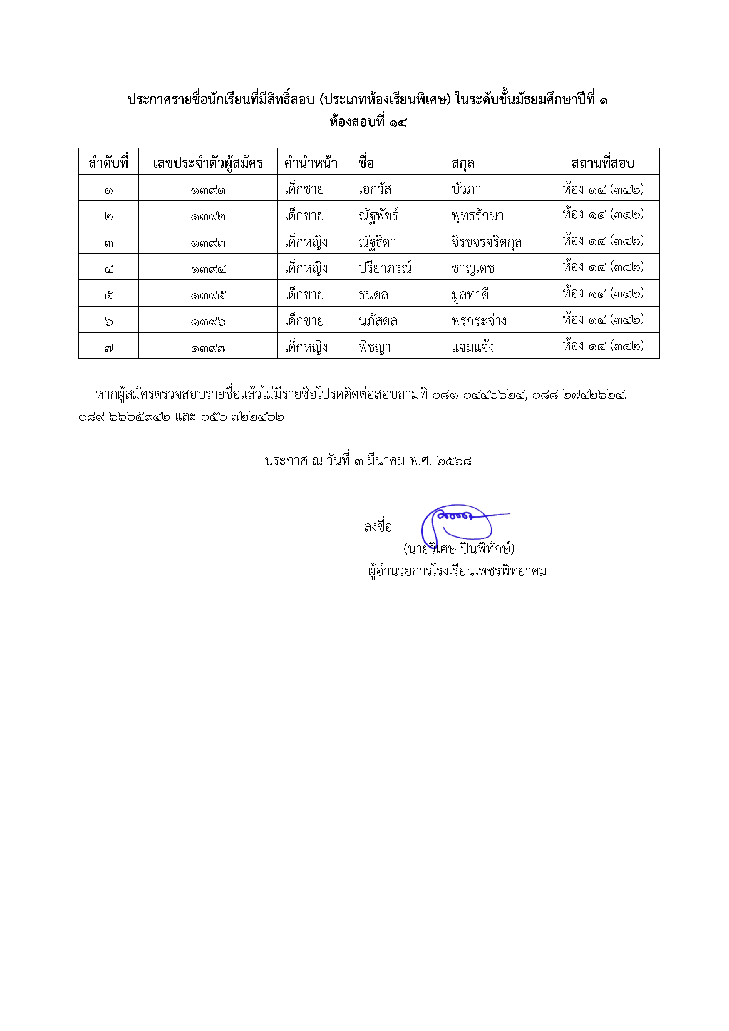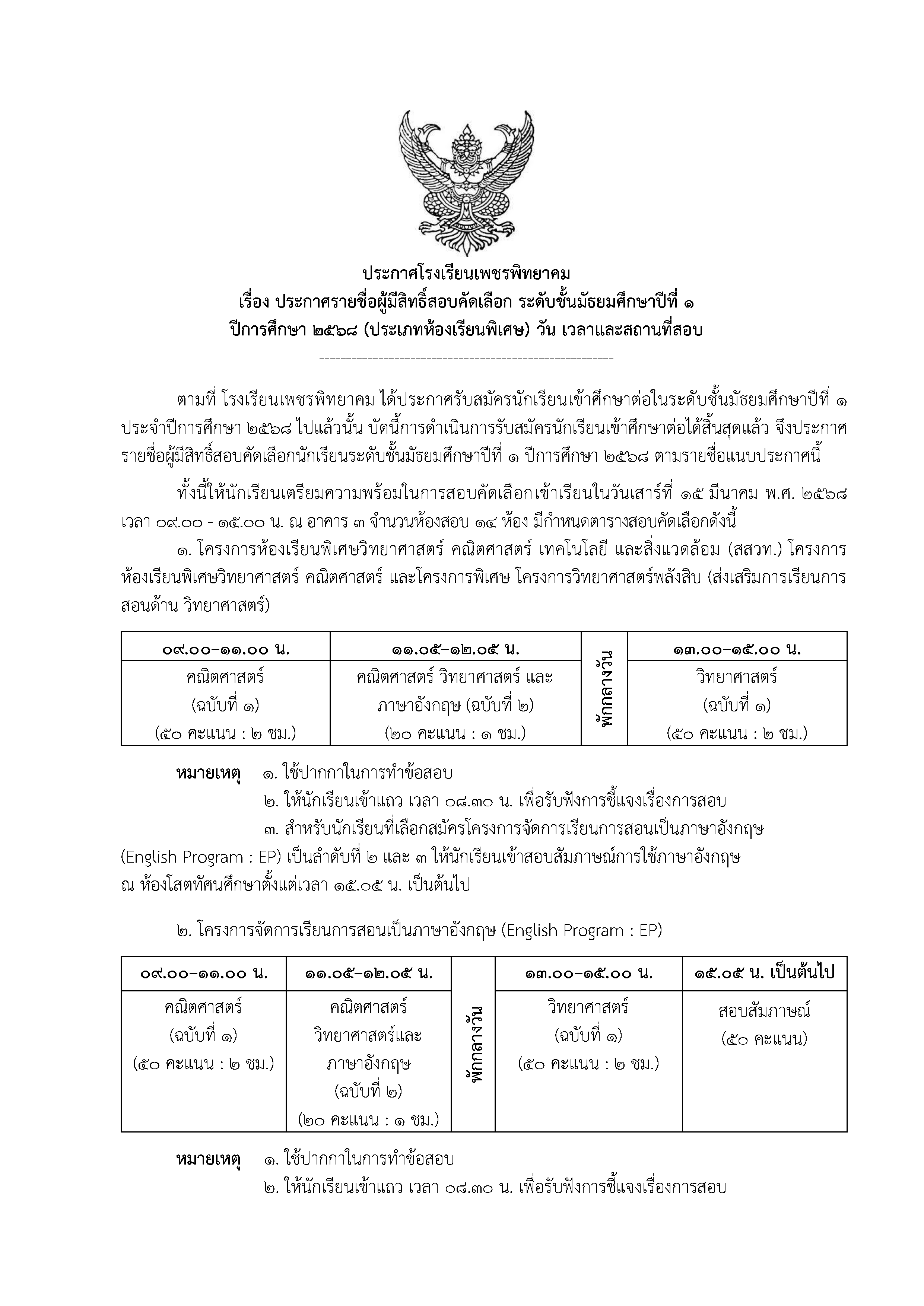 ประกาศโรงเรียนเพชรพิทยาคม เรื่อง ประกาศรายชื่อผู้มีสิทธิ์สอบคัดเลือก ระดับชั้นมัธยมศึกษาปีที่ 1 ปีการศึกษา 2568 (ประเภทห้องเรียนพิเศษ) วัน เวลาและสถานที่สอบ