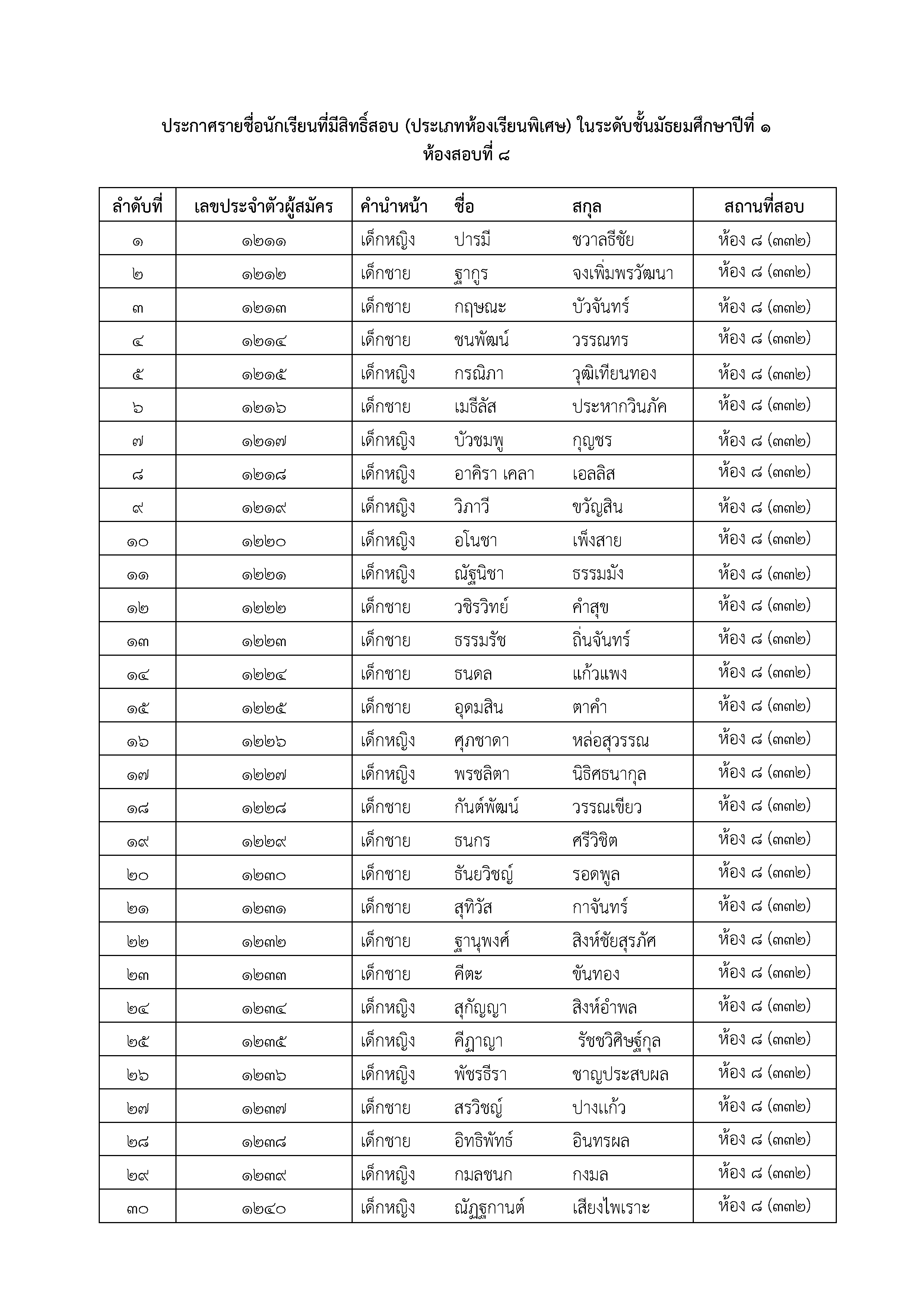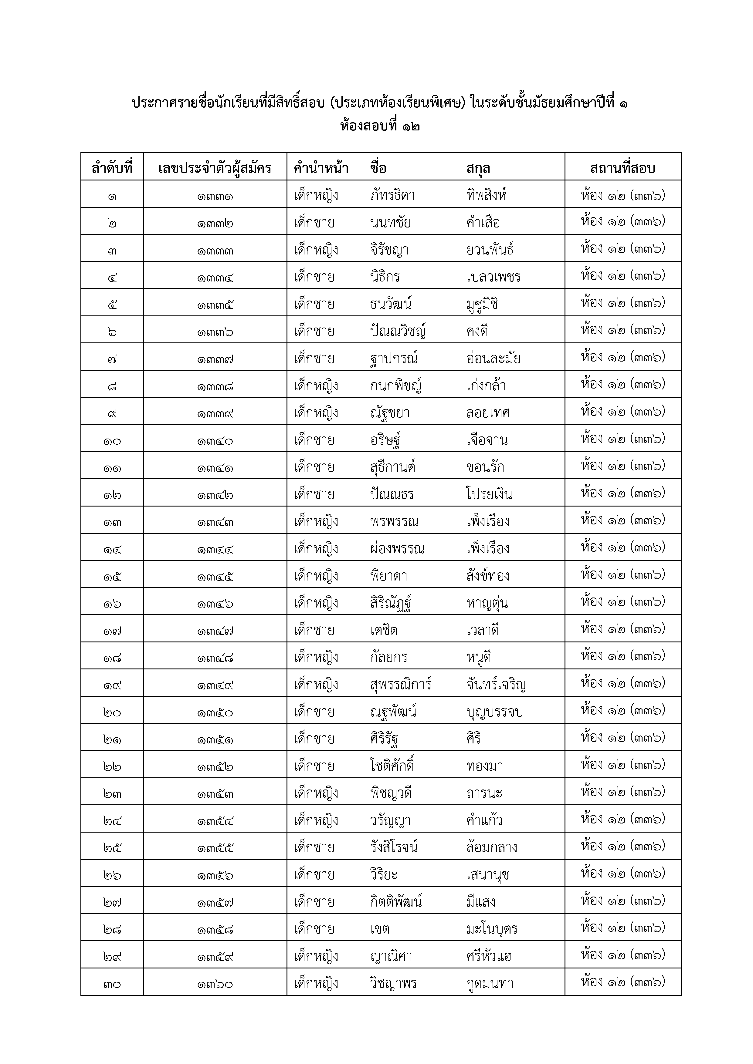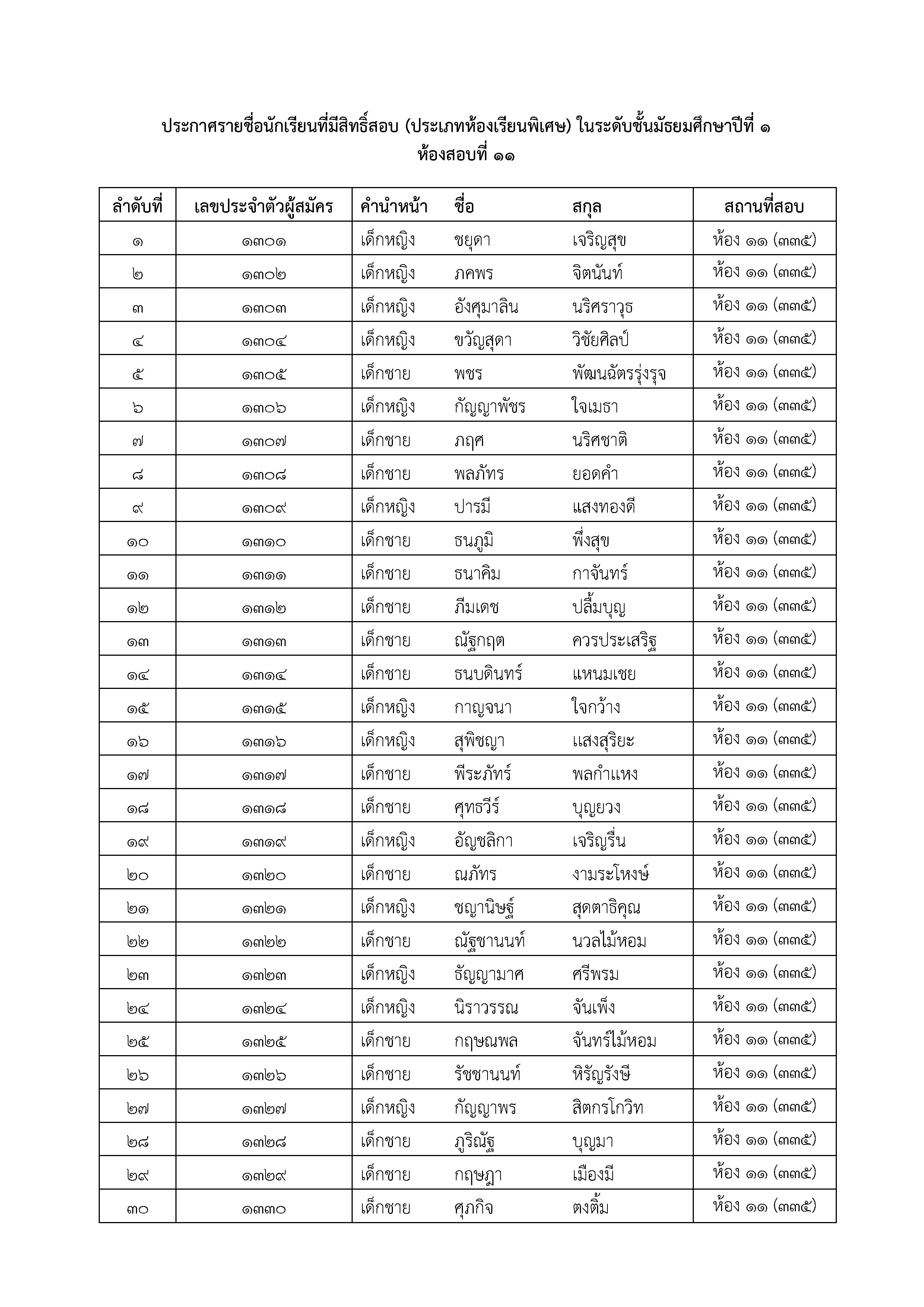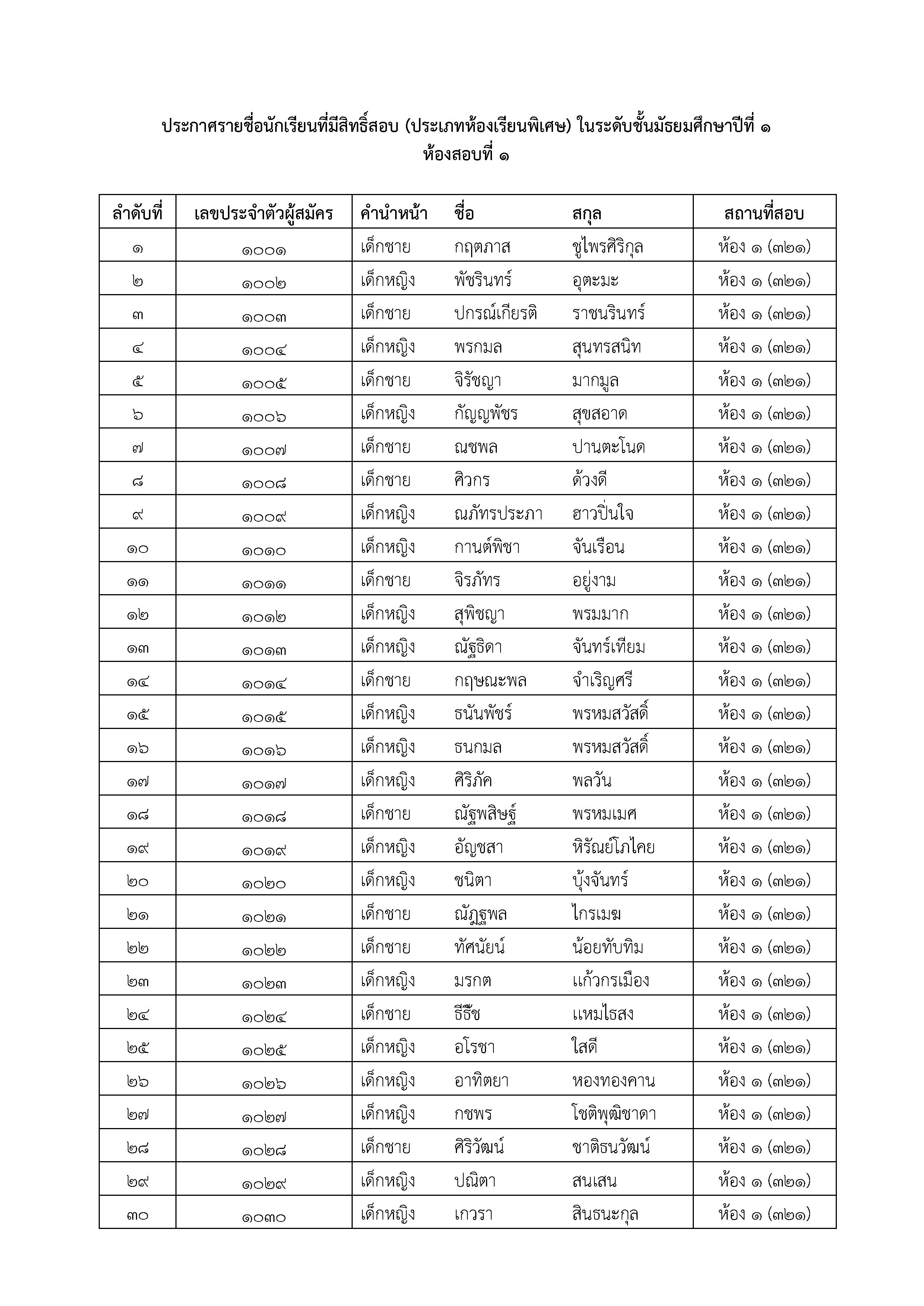 เรื่อง ประกาศรายชื่อผู้มีสิทธิ์สอบคัดเลือก ระดับชั้นมัธยมศึกษาปีที่ 1