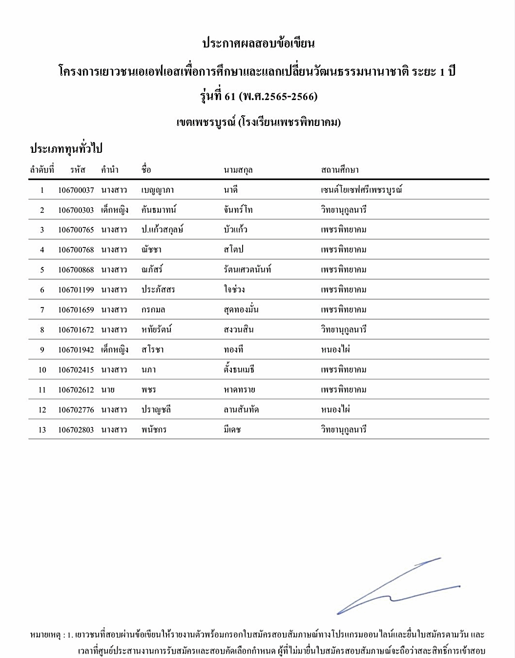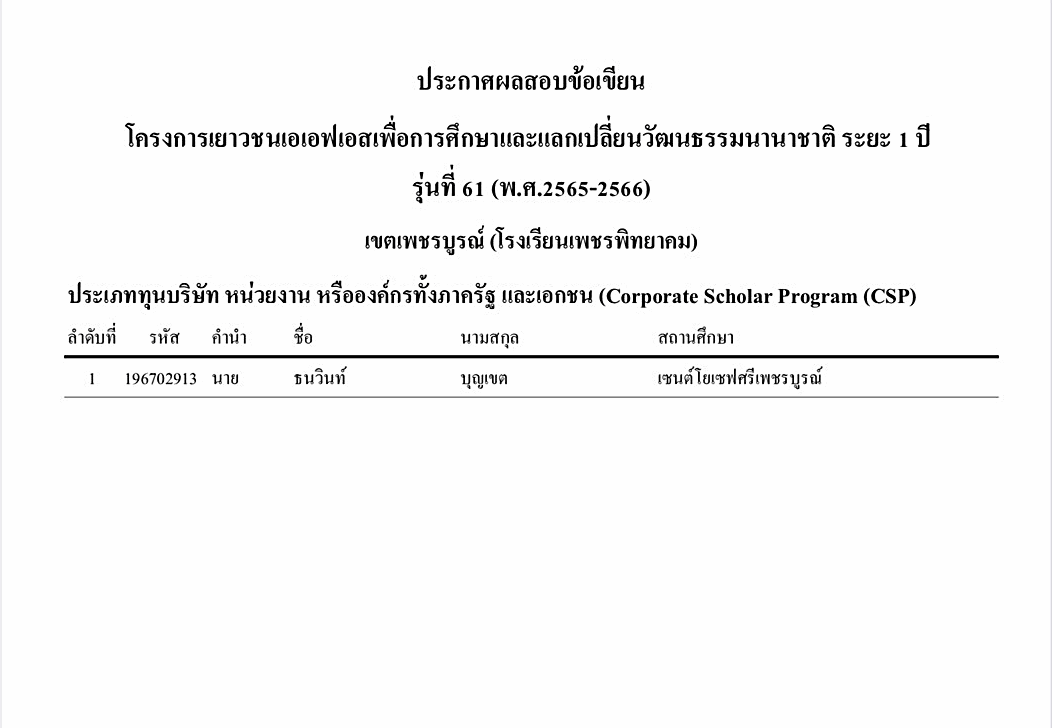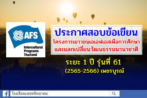 ประกาศสอบข้อเขียนโครงการเยาวชนเอเอฟเอสเพื่อการศึกษาและแลกเปลี่ยนวัฒนธรรมนานาชาติ ระยะ 1 ปี รุ่นที่ 61 (2565-2566) เพชรบูรณ์