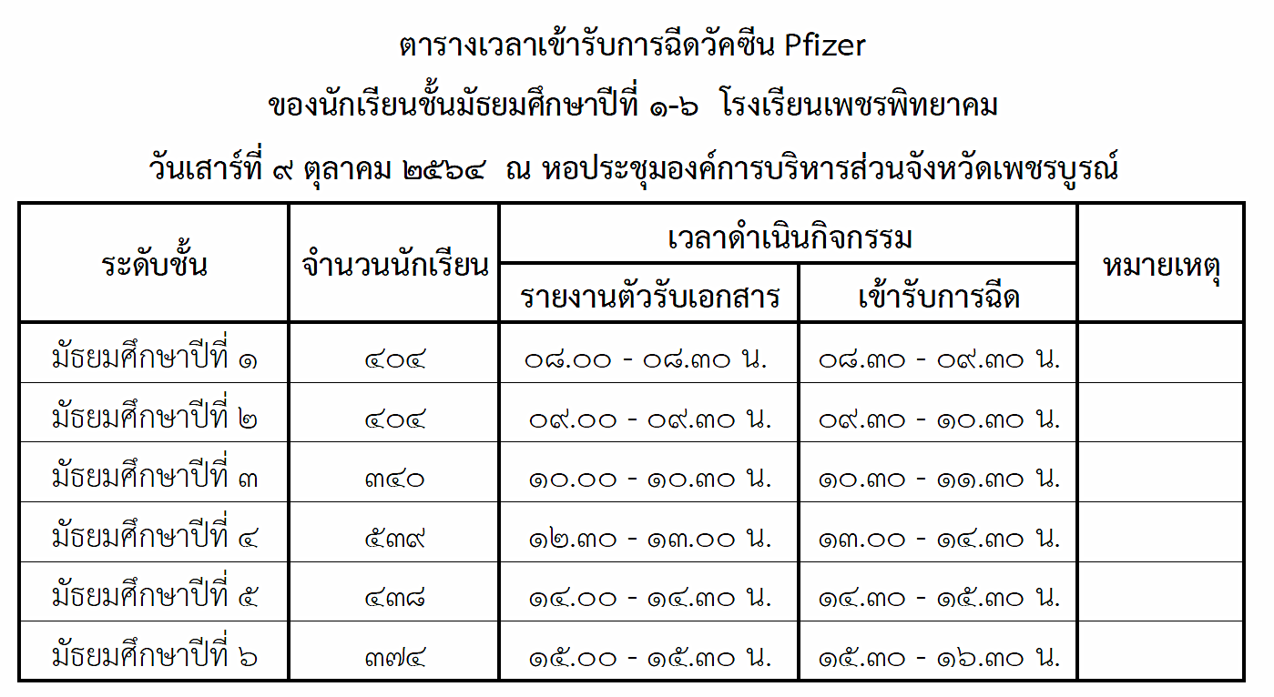 ด้วยโรงเรียนเพชรพิทยาคม ได้รับการประสานจากคณะกรรมการโรคติดต่อจังหวัดเพชรบูรณ์ และโรงพยาบาลเพชรบูรณ์ ตามหนังสือที่ พช.0032.205/2732 ลงวันที่ 4 ตุลาคม 2564 แจ้งแผนการออกให้บริการฉีดวัคซีนไฟเซอร์ให้กับนักเรียนโรงเรียนเพชรพิทยาคม ระดับชั้นมัธยมศึกษาปีที่ 1-6 ในวันเสาร์ที่ 9 ตุลาคม พ.ศ.2564 ณ หอประชุม องค์การบริหารส่วนจังหวัดเพชรบูรณ์ จึงให้นักเรียนที่แสดงความประสงค์รับวัคซีนตามที่โรงเรียนได้สำรวจไว้แล้ว ให้มารับการฉีดวัคซีนไฟเซอร์ตามวัน เวลา และสถานที่ ดังตารางแนบท้ายประกาศ