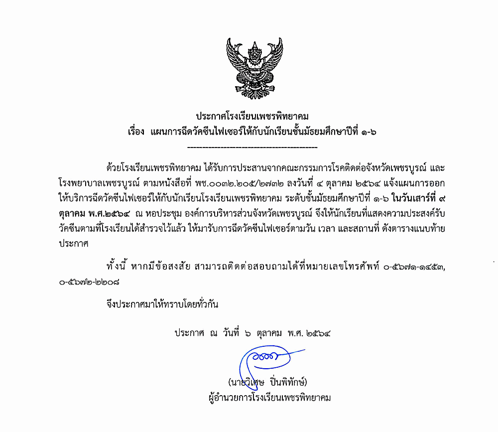 ประกาศโรงเรียนเพชรพิทยาคม เรื่อง แผนการฉีดวัคซีนไฟเซอร์ให้กับนักเรียนชั้นมัธยมศึกษาปีที่ 1-6