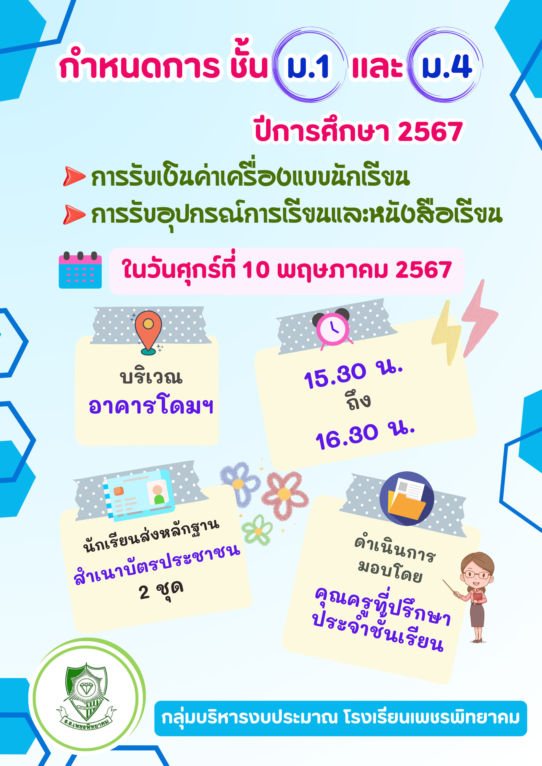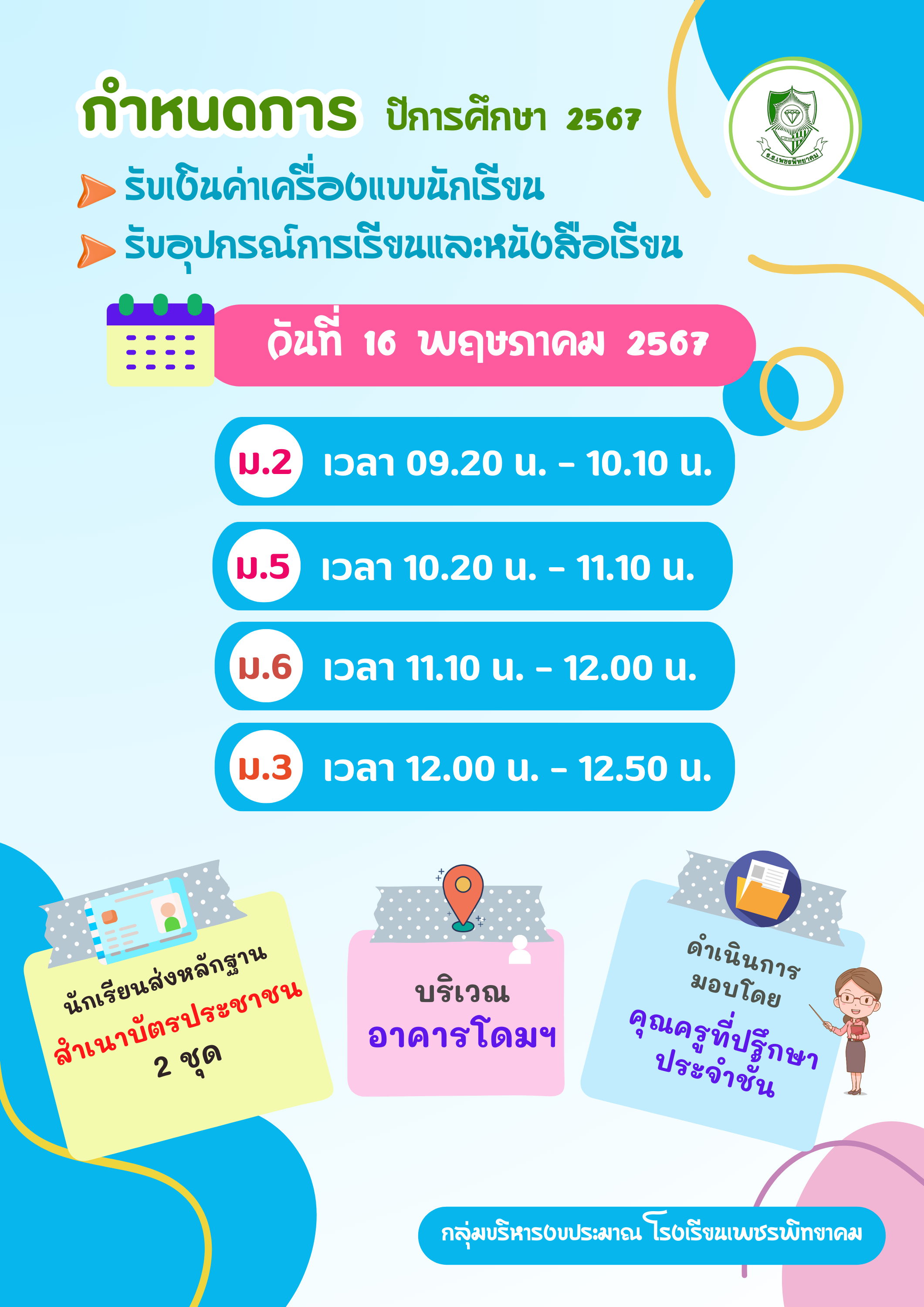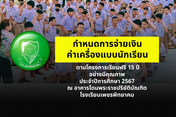 กำหนดการจ่ายเงินค่าเครื่องแบบนักเรียน ตามโครงการเรียนฟรี 15 ปี อย่างมีคุณภาพ ประจำปีการศึกษา 2567 ณ อาคารโดมพระราชปริยัติบัณฑิต โรงเรียนเพชรพิทยาคม