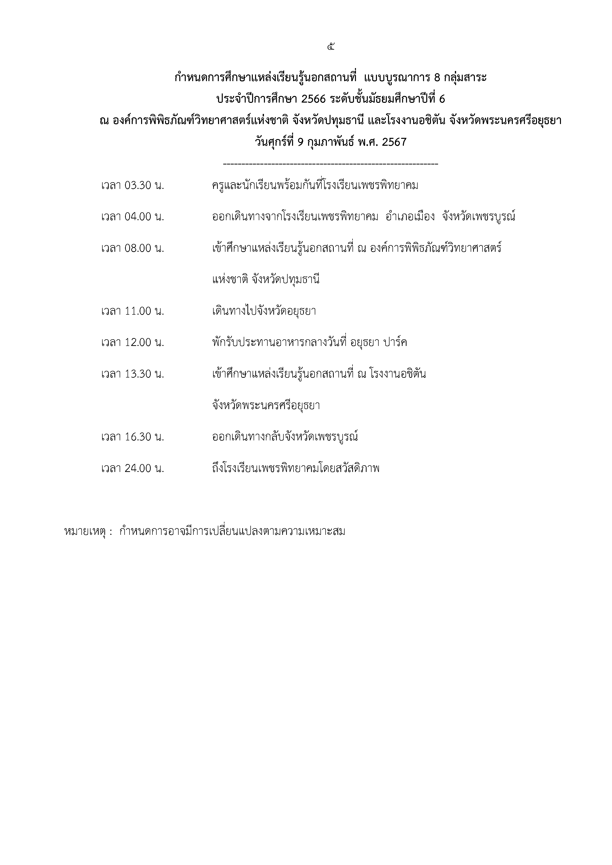 กำหนดการจัดกิจกรรมทัศนศึกษาแบบบูรณาการ 8 กลุ่มสาระฯ ชั้นมัธยมศึกษาปีที่ 6 ณ องค์การพิพิธภัณฑ์วิทยาศาสตร์แห่งชาติ จังหวัดปทุมธานี และโรงงานอชิตัน จังหวัดพระนครศรีอยุธยา วันที่ 9 กุมภาพันธ์ 2567