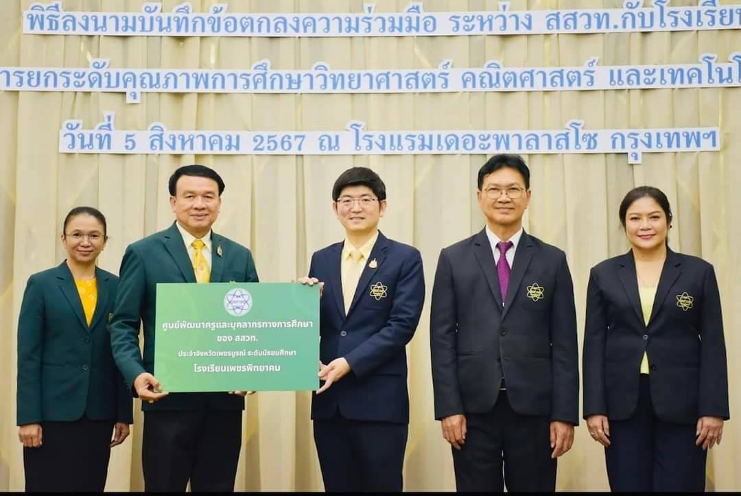 วันที่ 5 สิงหาคม พ.ศ.2567 นายวิเศษ ปิ่นพิทักษ์ ผู้อำนวยการเชี่ยวชาญ โรงเรียนเพชรพิทยาคม พร้อมด้วยนางดวงตะวัน นามา รองผู้อำนวยการกลุ่มบริหารวิชาการ เข้าร่วมพิธีลงนามบันทึกข้อตกลงความร่วมมือ ระหว่าง สสวท. กับโรงเรียน ในโครงการยกระดับคุณภาพการศึกษาวิทยาศาสตร์ คณิตศาสตร์และเทคโนโลยี เชิงพื้นที่ โดยมี รศ.ดร.ธีระเดช เจียรสุขสกุล ผู้อำนวยการ สสวท. เป็นประธานในพิธีเปิด และรับฟังการบรรยายพิเศษ เรื่อง การเสริมสร้างสมรรถนะความฉลาดรู้สู่การพัฒนาคุณภาพผู้เรียน โดย ดร. เกศทิพย์ ศุภวานิช รองเลขาธิการคณะกรรมการการศึกษาขั้นพื้นฐาน และ ดร.เขมวดี พงศานนท์ ผู้อำนวยการฝ่ายพัฒนาครูและบุคลากรทางการศึกษา สสวท. ชี้แจงบทบาทหน้าที่ของศูนย์พัฒนาครูและบุคลากรทางการศึกษา ของ สสวท. ประจำจังหวัดเพชรบูรณ์ ระดับมัธยมศึกษา ณ โรงแรมเดอะพาลาสโซ กรุงเทพฯ