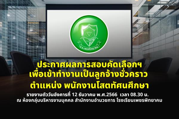 ตามที่โรงเรียนเพชรพิทยาคม ประกาศรับสมัครสอบคัดเลือกบุคคลเพื่อเข้าทำงานเป็นลูกจ้างชั่วคราว ตำแหน่ง พนักงานโสตทัศนศึกษา ระหว่างวันที่ ๒๓ - ๒๘ พฤศจิกายน ๒๕๖๖ ตามประกาศโรงเรียนเพชรพิทยาคม เรื่อง รับสมัครสอบคัดเลือกบุคคลเพื่อเข้าทำงานเป็นลูกจ้างชั่วคราว ตำแหน่ง พนักงานโสตทัศนศึกษา ลงวันที่ ๒๓ พฤศจิกายน พ.ศ.๒๕๖๖ ในระหว่างวันที่ ๒๙ พฤศจิกายน - ๕ ธันวาคม ๒๕๖๖ และดำเนินการสอบคัดเลือก ในวันที่ ๗ ธันวาคม ๒๕๖๖ นั้น