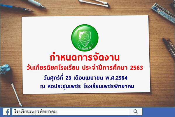 ด้วยโรงเรียนเพชรพิทยาคม กำหนดการจัดงานวันเกียรติยศโรงเรียน พิธีมอบรางวัลเชิดชูเกียรติให้แก่นักเรียน ข้าราชการครูและบุคลากรทางการศึกษาที่มีผลงานดีเด่น ประจำปีการศึกษา 2563 วันศุกร์ที่ 23 เดือนเมษายน พ.ศ.2564 โดยมีกำหนดการดังนี้