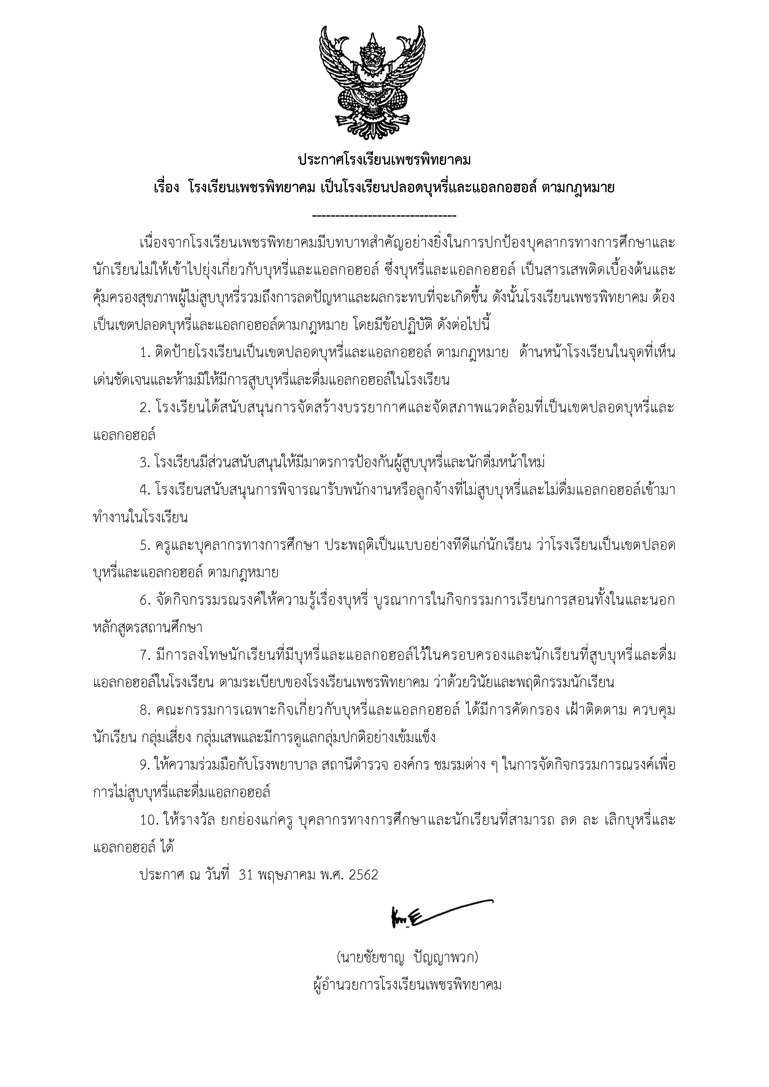 ประกาศโรงเรียนเพชรพิทยาคม เรื่อง โรงเรียนเพชรพิทยาคม เป็นโรงเรียนปลอดบุหรี่และแอลกอฮอล์ ตามกฎหมาย