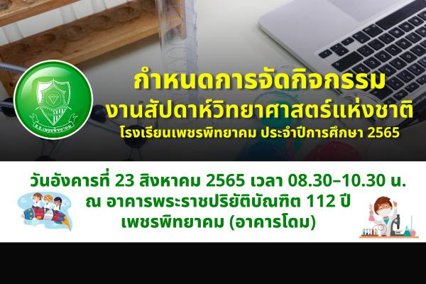 โรงเรียนเพชรพิทยาคม กำหนดงานสัปดาห์วิทยาศาสตร์แห่งชาติ ประจำปี 2565 ณ อาคารพระราชปริยัติบัณฑิต 112 ปี เพชรพิทยาคม (อาคารโดม) ในวันอังคารที่ 23 สิงหาคม 2565 เวลา 08.30–10.30 น.