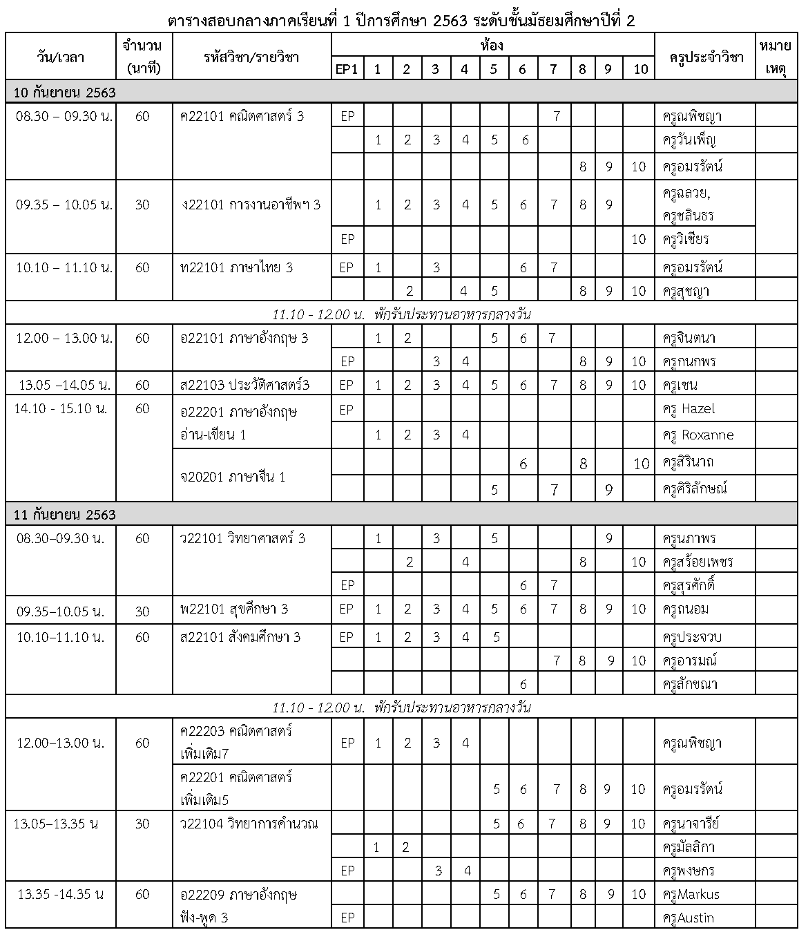 ตารางสอบกลางภาคเรียนที่ 1 ปีการศึกษา 2563 ระดับชั้นมัธยมศึกษาปีที่ 2