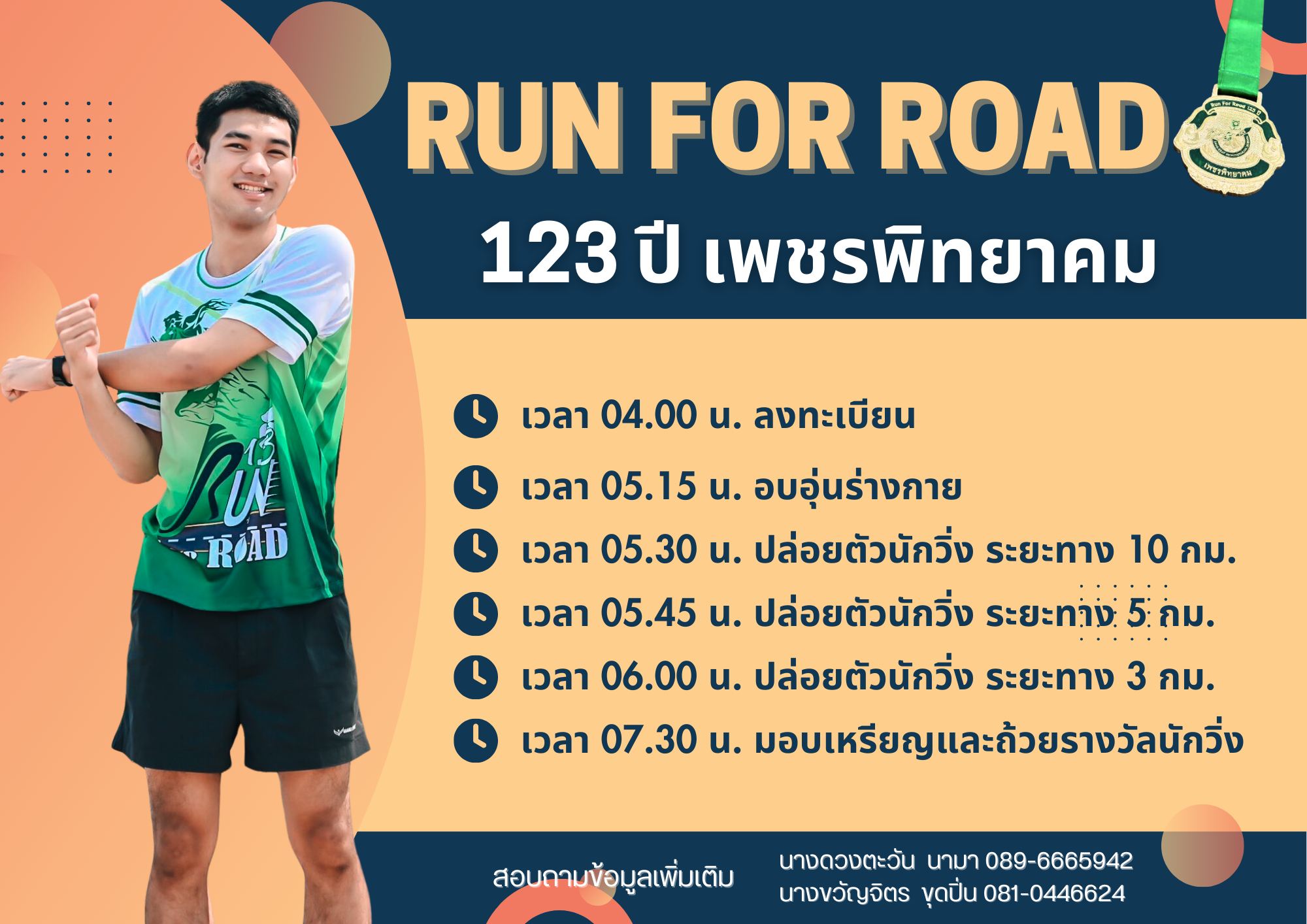 กำหนดการ RUN FOR ROAD 123 ปี เพชรพิทยาคม วันที่ 11 เมษายน 2567 ลงทะเบียน 04.00 น.