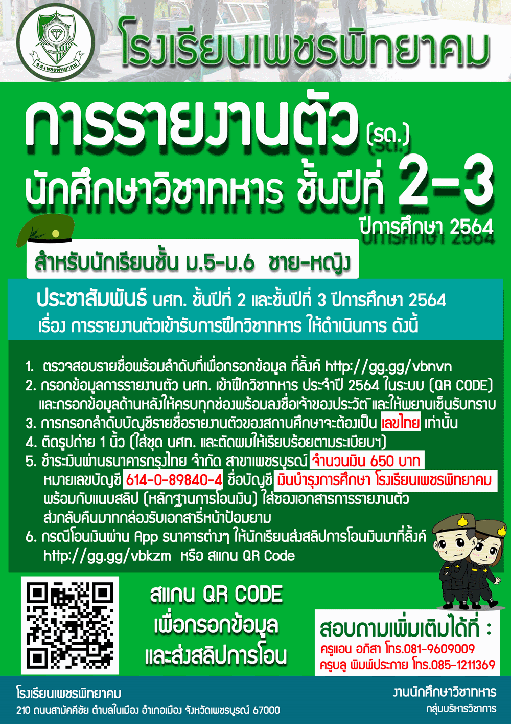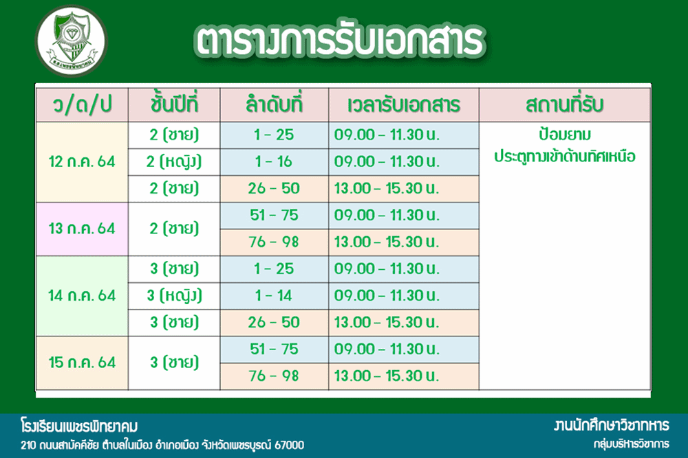 5. ให้นักเรียนชำระเงินผ่านธนาคารกรุงไทย จำกัด สาขาเพชรบูรณ์ จำนวนเงิน 650 บาท หมายเลขบัญชี 614-0-89840-4 ชื่อบัญชี เงินบำรุงการศึกษา โรงเรียนเพชรพิทยาคม พร้อมกับแนบสลิป (หลักฐานการโอนเงิน) ส่งกลับคืนมาที่หน้าห้องป้อมยามพร้อมกล่องรับใส่เอกสาร