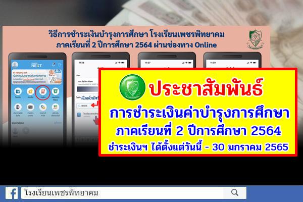 ประชาสัมพันธ์ กลุ่มบริหารงบประมาณ การชำระเงินค่าบำรุงการศึกษา ภาคเรียนที่ 2 ปีการศึกษา 2564 ชั้นมัธยมศึกษาปีที่ 1-6 ชำระเงินฯ ได้ตั้งแต่วันนี้ - 30 มกราคม 2565