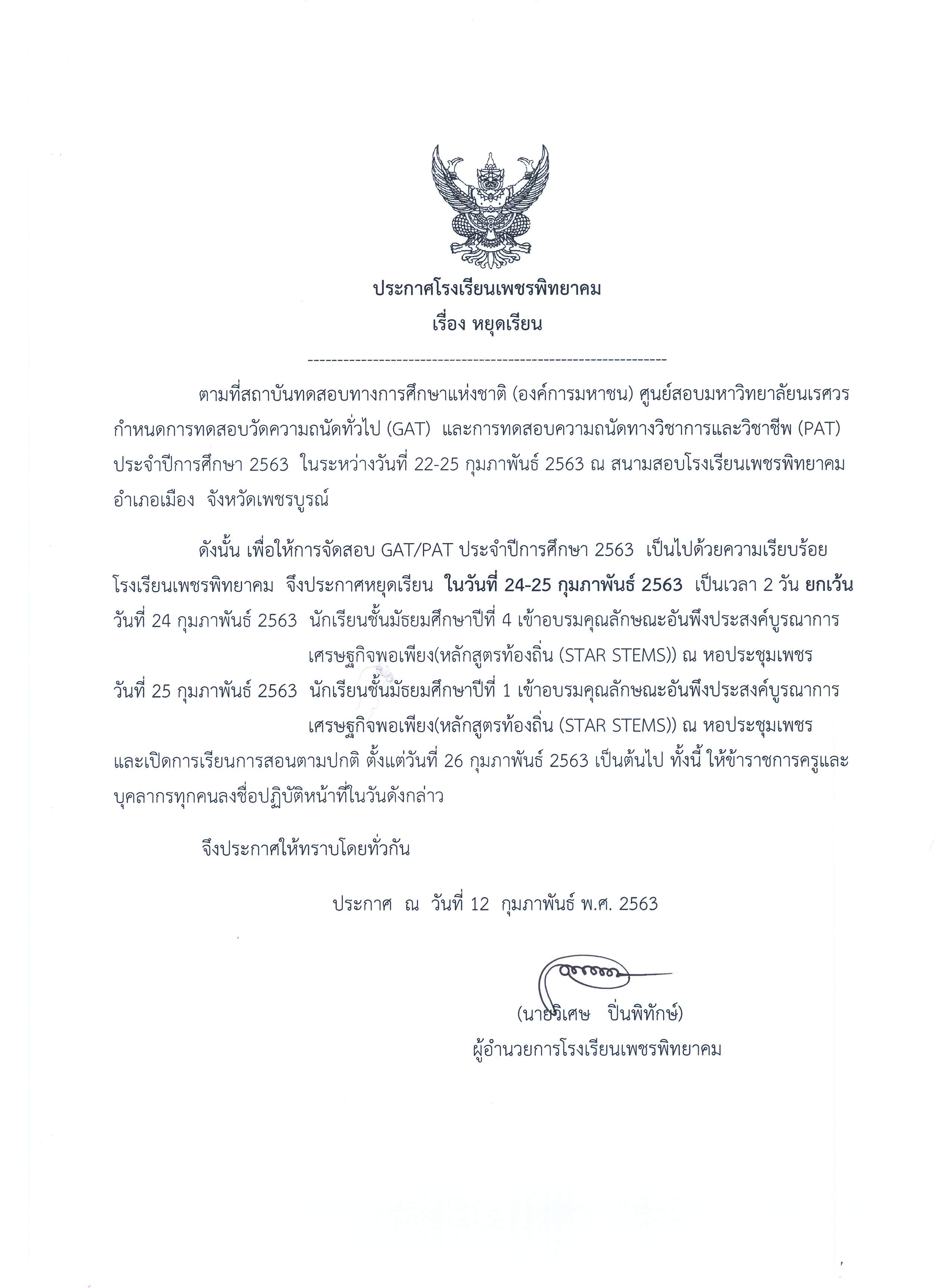 ดังนั้น เพื่อให้การจัดสอบ GAT/PAT ประจปีการศึกษา 2563 เป็นไปด้วยความเรียบร้อย โรงเรียนเพชรพิทยาคม จึงประกาศหยุดเรียน ในวันที่ 24-25 กุมภาพันธ์ 2563 เป็นเวลา 2 วัน