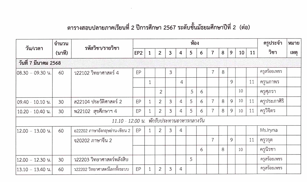 ตารางสอบปลายภาคเรียนที่ 2 ปีการศึกษา 2567 ชั้น ม.2 ระหว่างวันที่ 5-7 มีนาคม 2568