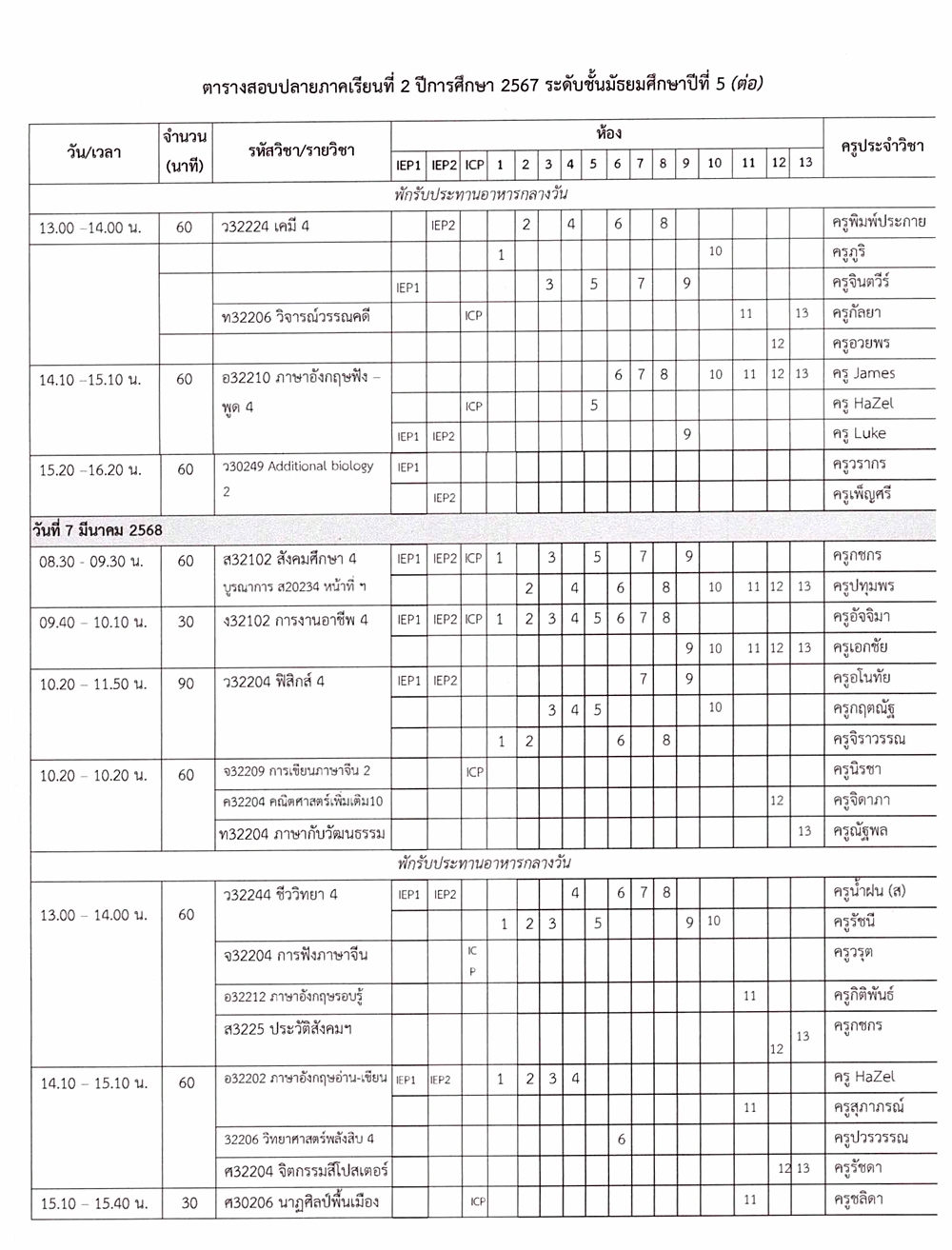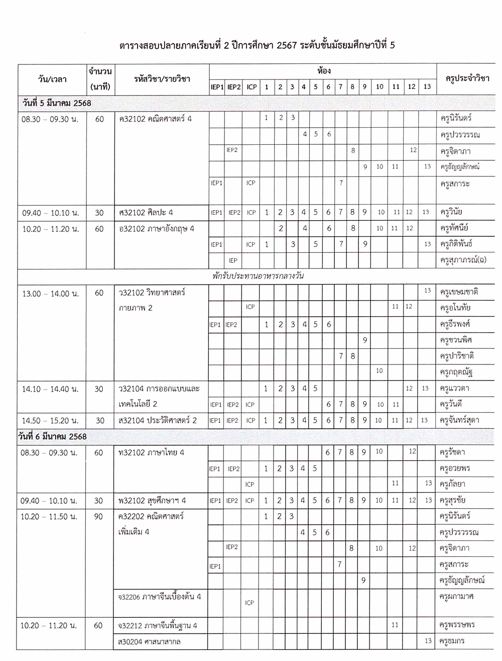 ตารางสอบปลายภาคเรียนที่ 2 ปีการศึกษา 2567 ชั้น ม.5 ระหว่างวันที่ 5-7 มีนาคม 2568