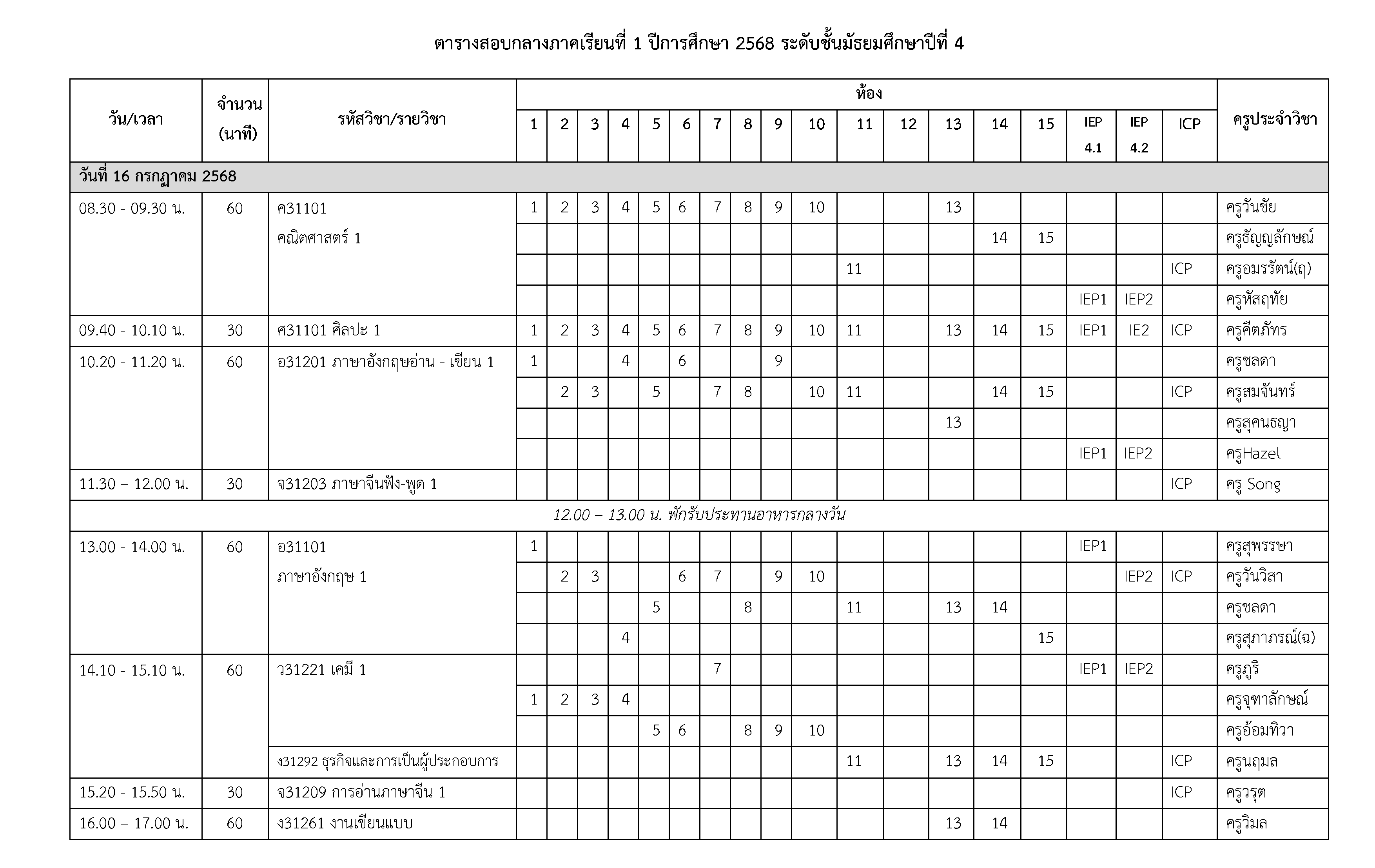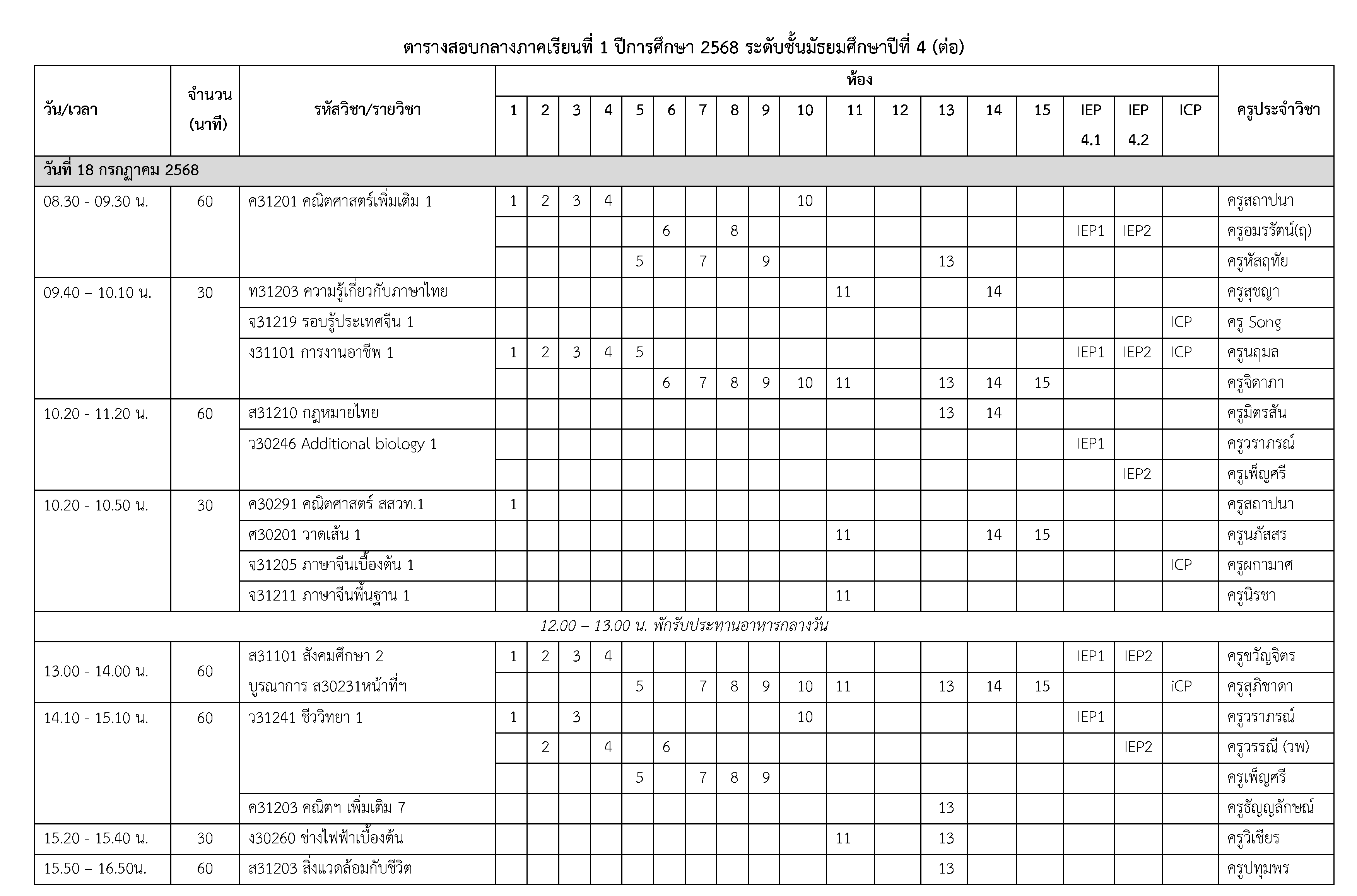 ตารางสอบกลางภาคเรียนที่ 1 ปีการศึกษา 2568 ระดับชั้นมัธยมศึกษาปีที่ 4 ระหว่างวันที่ 16-18 กรกฎาคม 2568