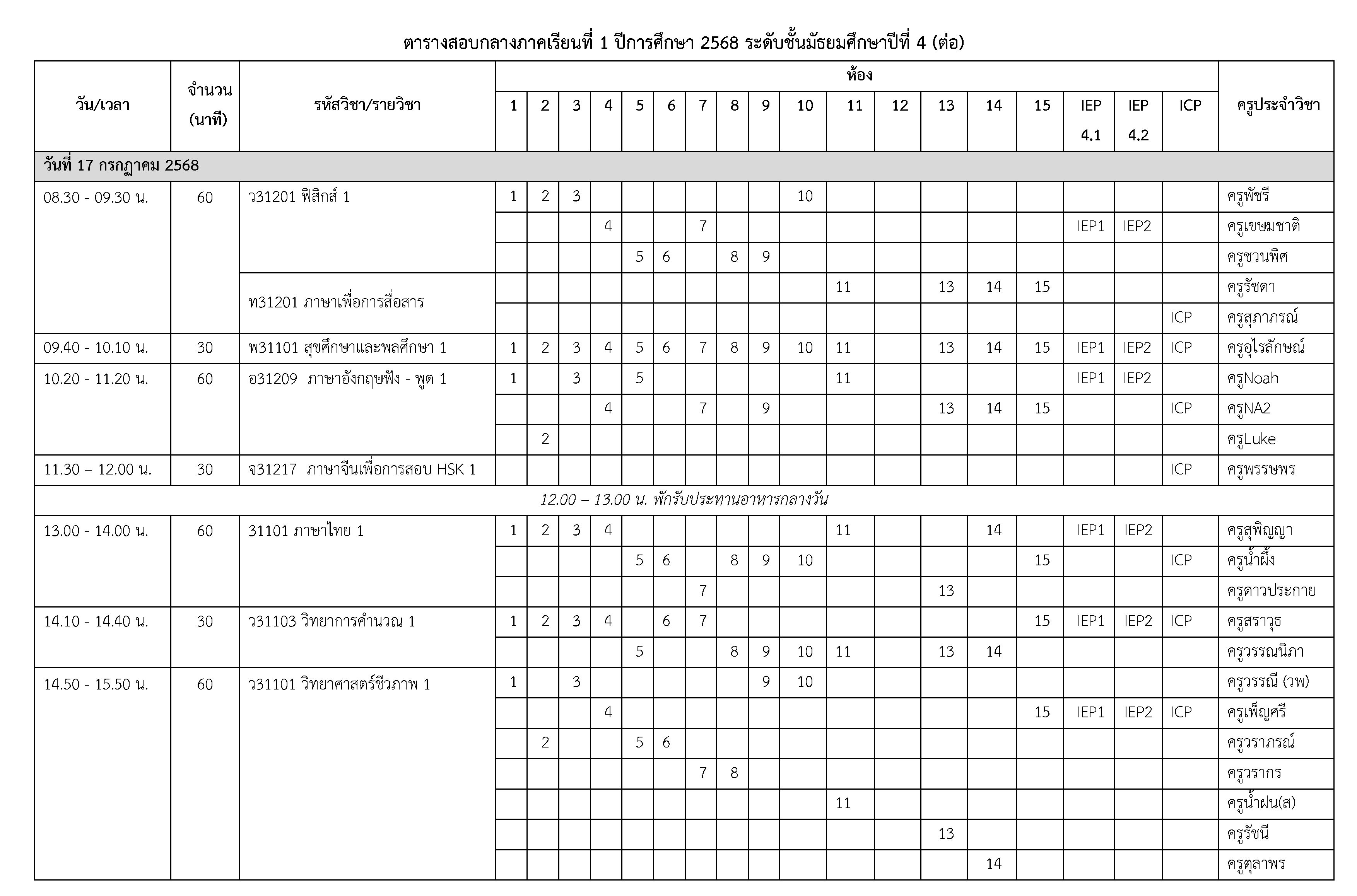 ตารางสอบกลางภาคเรียนที่ 1 ปีการศึกษา 2568 ระดับชั้นมัธยมศึกษาปีที่ 4