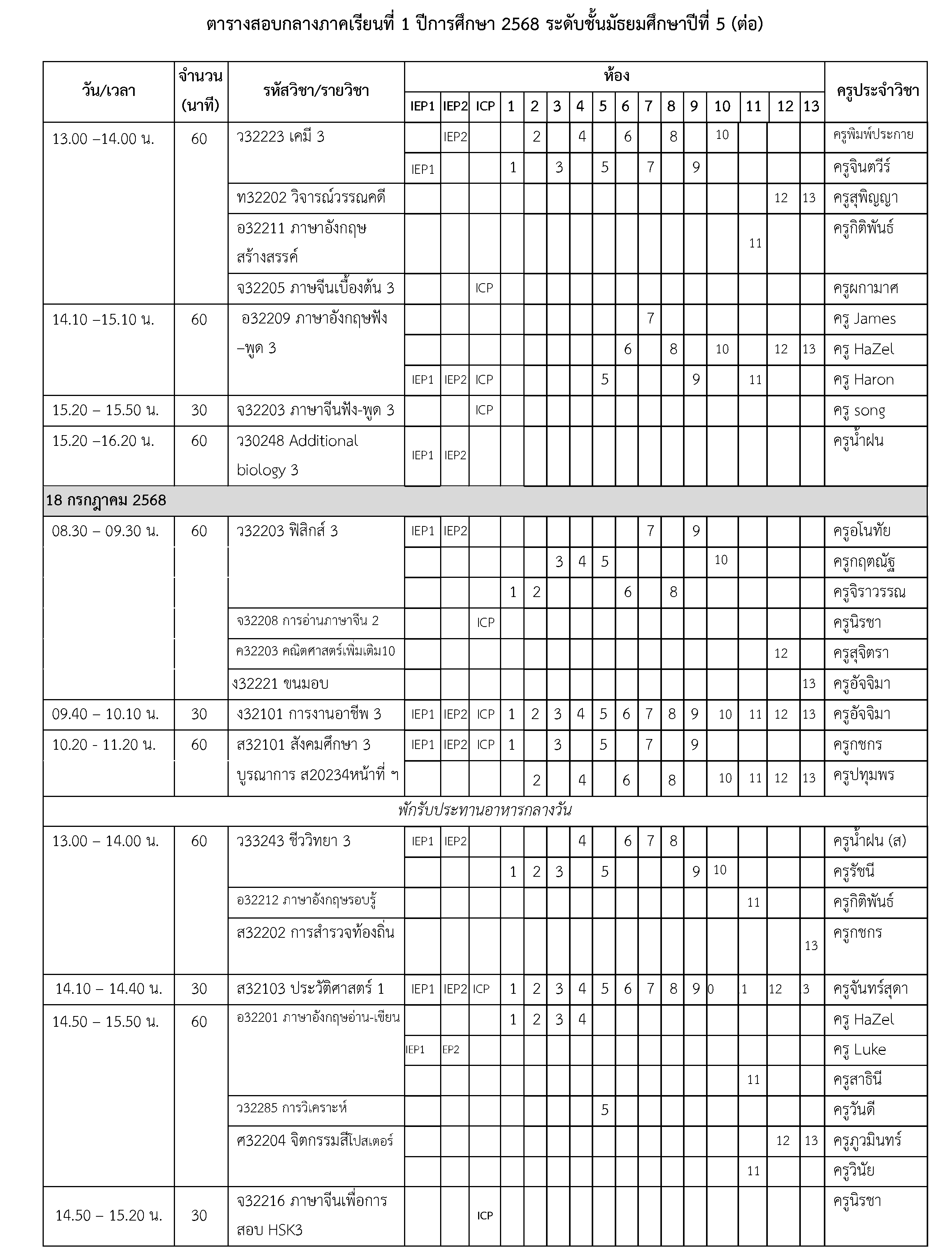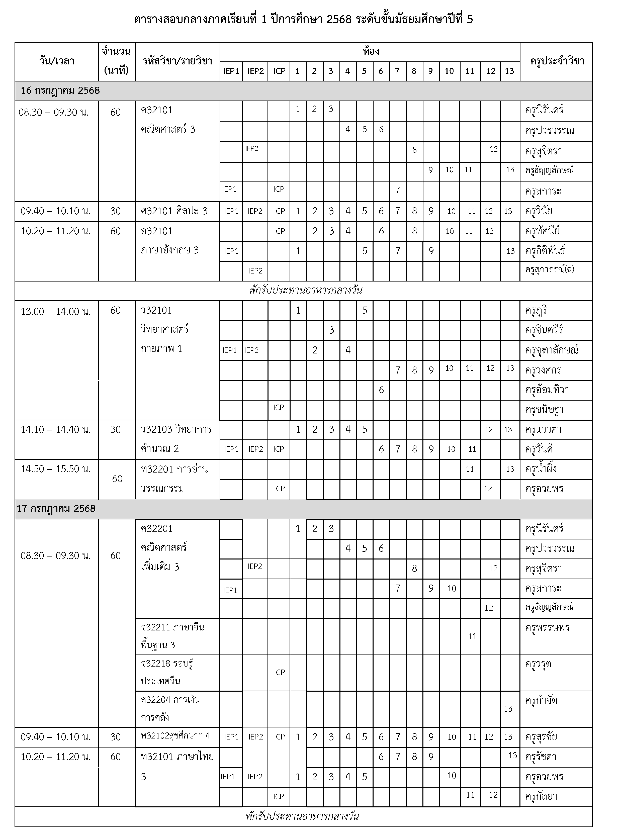 ตารางสอบกลางภาคเรียนที่ 1 ปีการศึกษา 2568 ระดับชั้นมัธยมศึกษาปีที่ 5 ระหว่างวันที่ 16-18 กรกฎาคม 2568